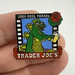 Below is our current selection of Trader Joe’s Rose Parade pins, including notable examples such as the 2007 sea life pin and the 2009 Godzilla with popcorn pin. Each design reflects the playful branding and inventive spirit Trader Joe’s brings to the parade year after year, securing these pins a lasting place in Rose Parade pin history. You can always find our most up-to-date pin offering by browsing our Trader Joe’s pins.