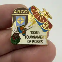 This pin commemorates the 100th Tournament of Roses Rose Parade, featuring a detailed depiction of a stunt plane mid-flight against a backdrop of a brown barn with the ARCO logo prominently displayed. The imagery captures the festive spirit of the event while highlighting the partnership with the ARCO gas brand, a staple in California’s history since the early 20th century.