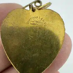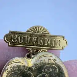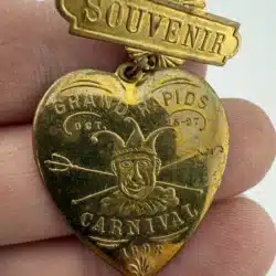 This rare 1898 Grand Rapids, Michigan Carnival souvenir pin brooch features a jester on a heart, capturing the festive spirit of the event held October 25-27. The piece was manufactured by the Schwaab’s Stamp and Seal Company of Milwaukee, Wisconsin, a firm that remains in operation today.