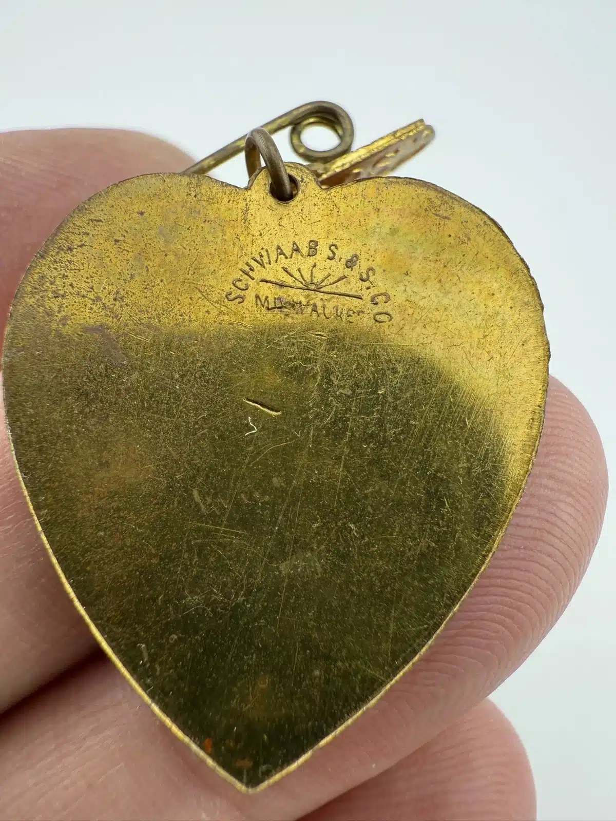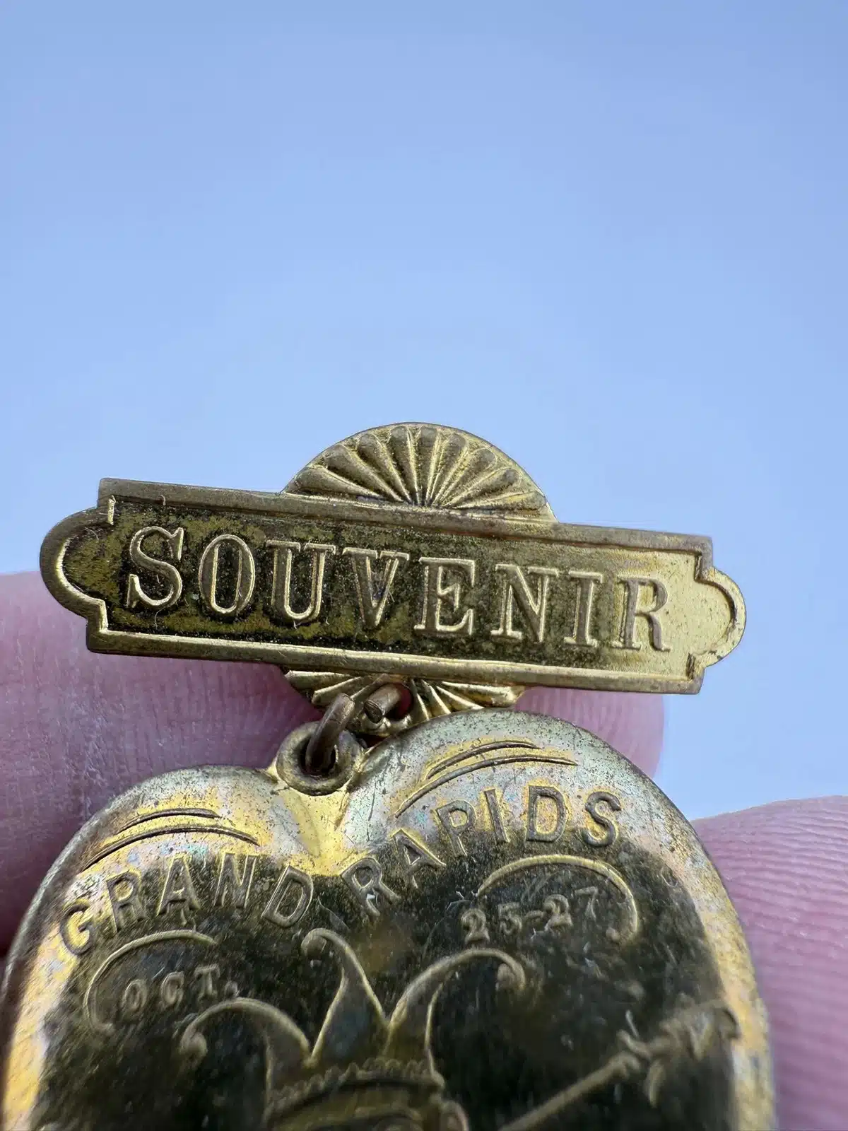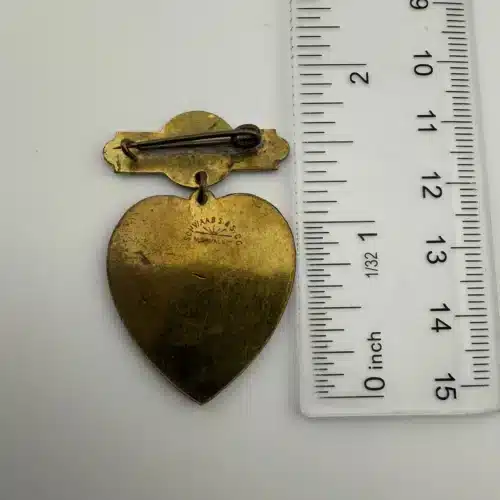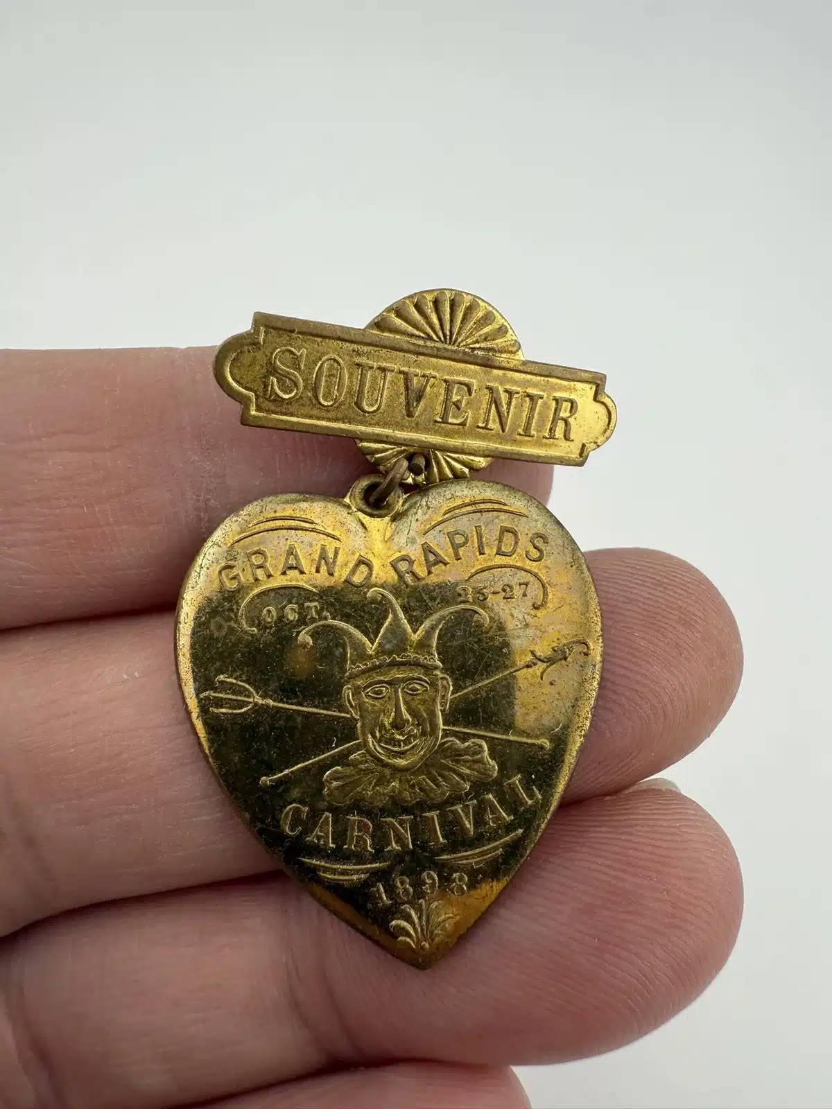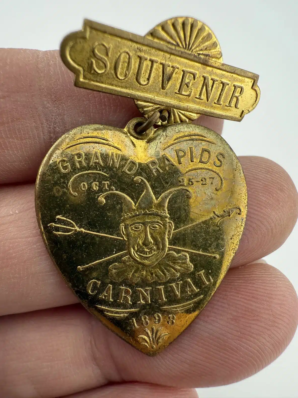 This rare 1898 Grand Rapids, Michigan Carnival souvenir pin brooch features a jester on a heart, capturing the festive spirit of the event held October 25-27. The piece was manufactured by the Schwaab’s Stamp and Seal Company of Milwaukee, Wisconsin, a firm that remains in operation today.