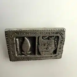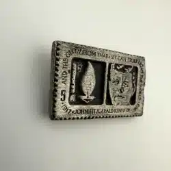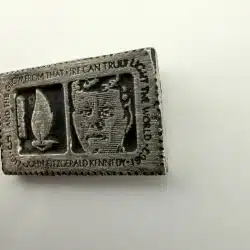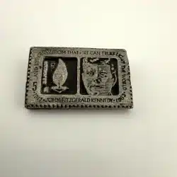 This pin is modelled after the John F. Kennedy 5 Cent Stamp from the USPS. Unique piece with unknown origins.