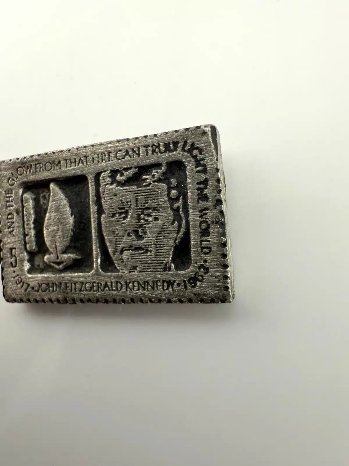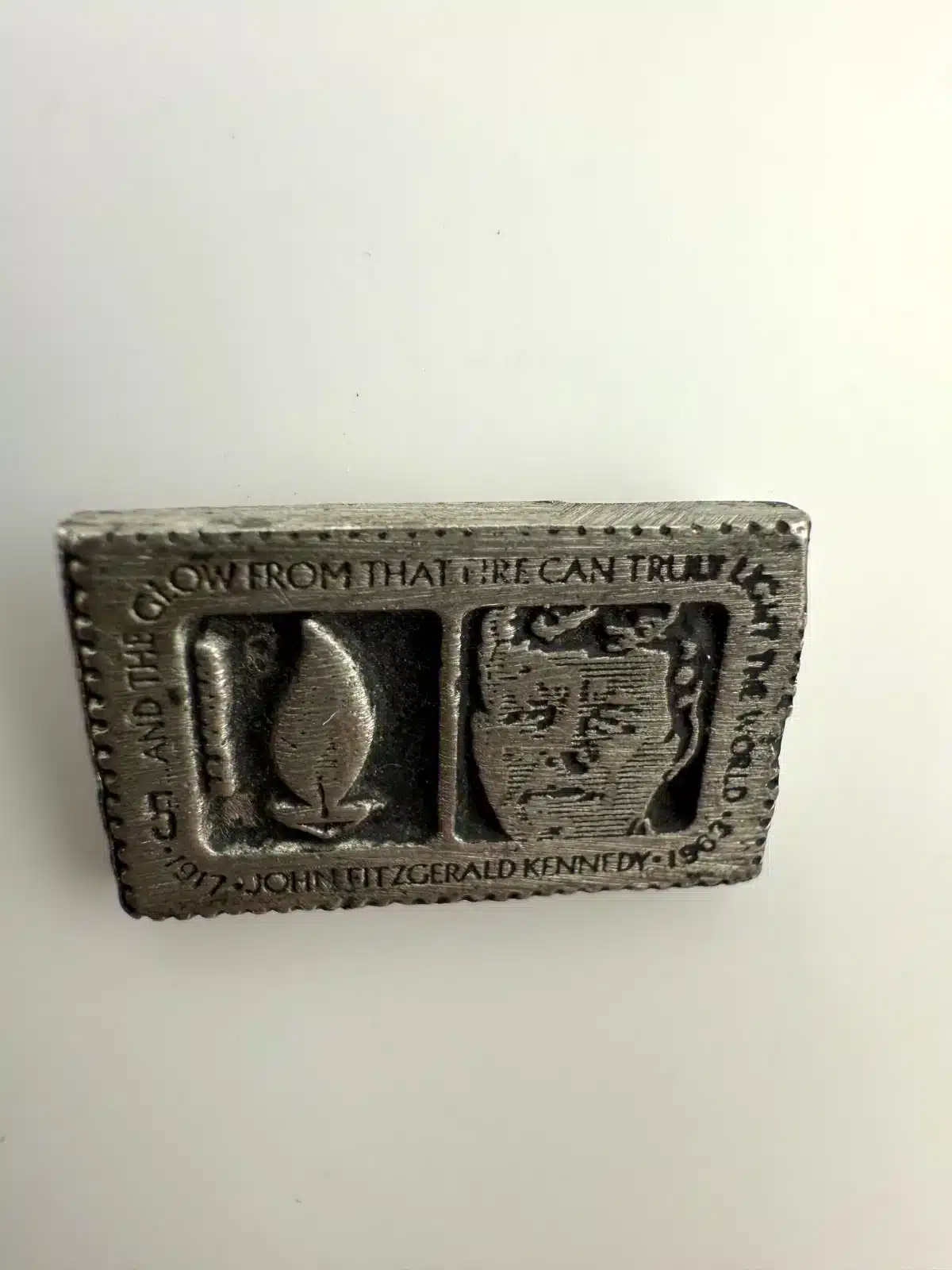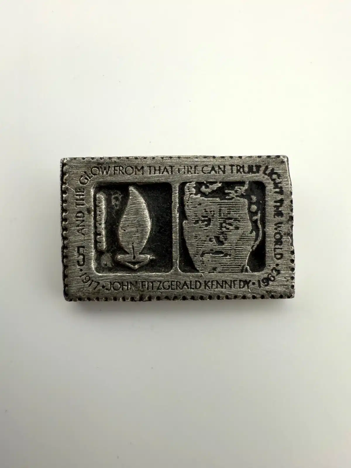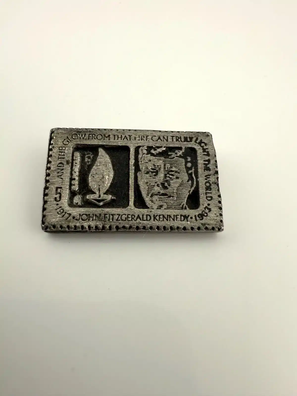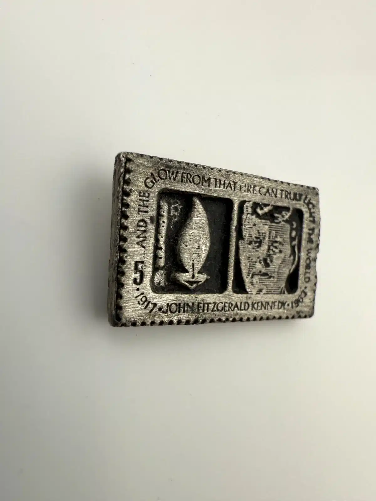 This pin is modelled after the John F. Kennedy 5 Cent Stamp from the USPS. Unique piece with unknown origins.