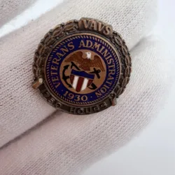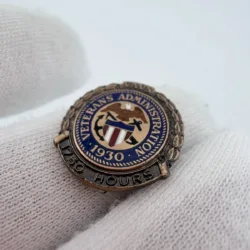 This nicely detailed pin is circular with “VAVS” across the top and “1750 Hours” along the bottom. At the center is an eagle perched on a crest surrounded by the wording “Veterans Administration 1930.”