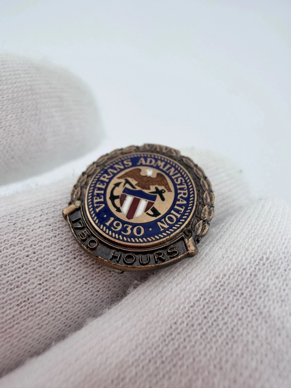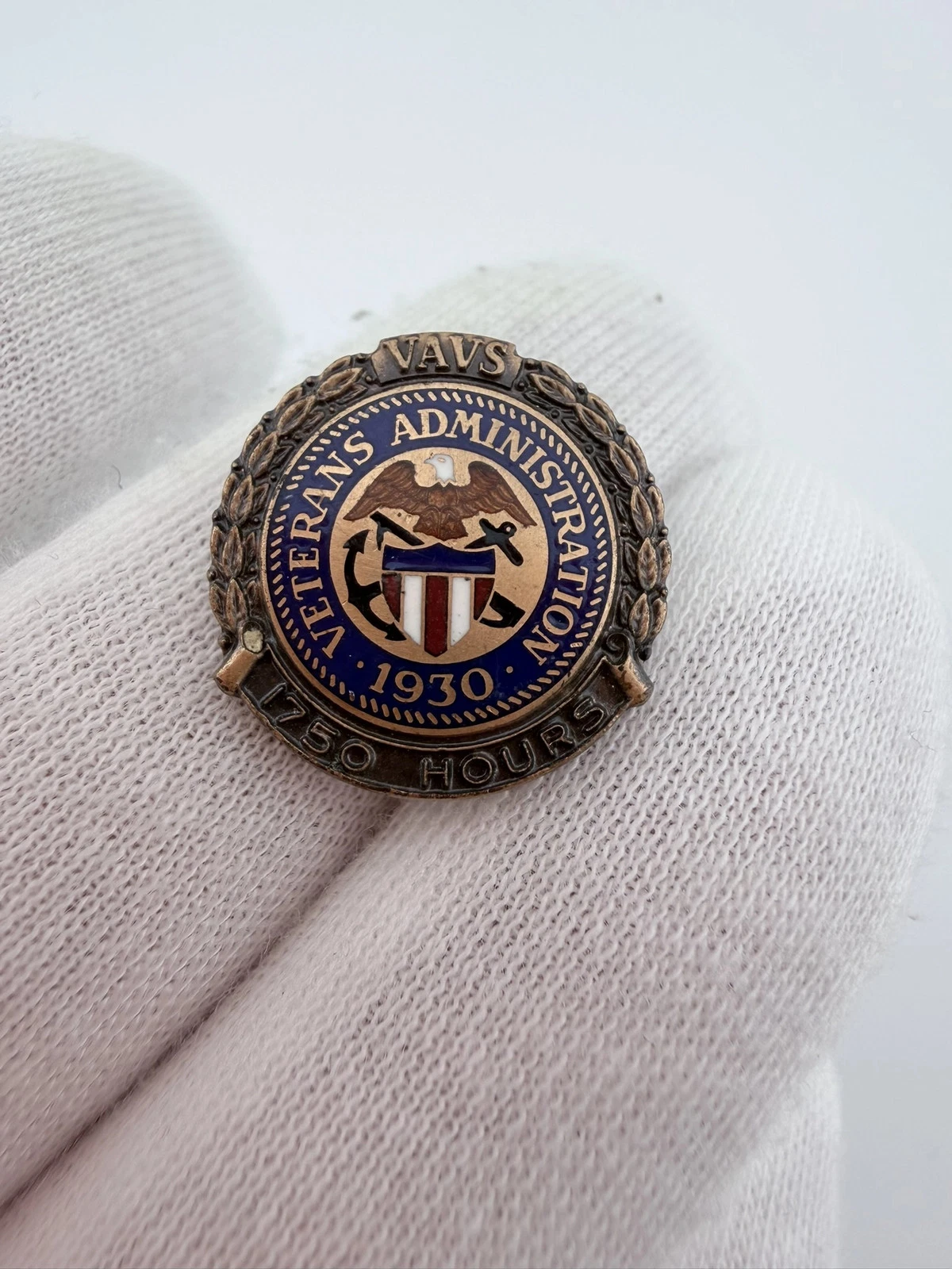 This nicely detailed pin is circular with “VAVS” across the top and “1750 Hours” along the bottom. At the center is an eagle perched on a crest surrounded by the wording “Veterans Administration 1930.”