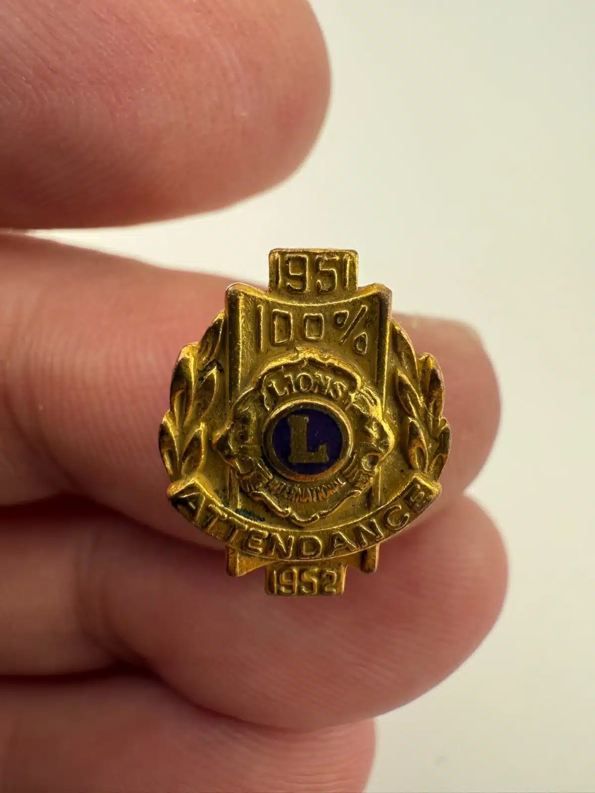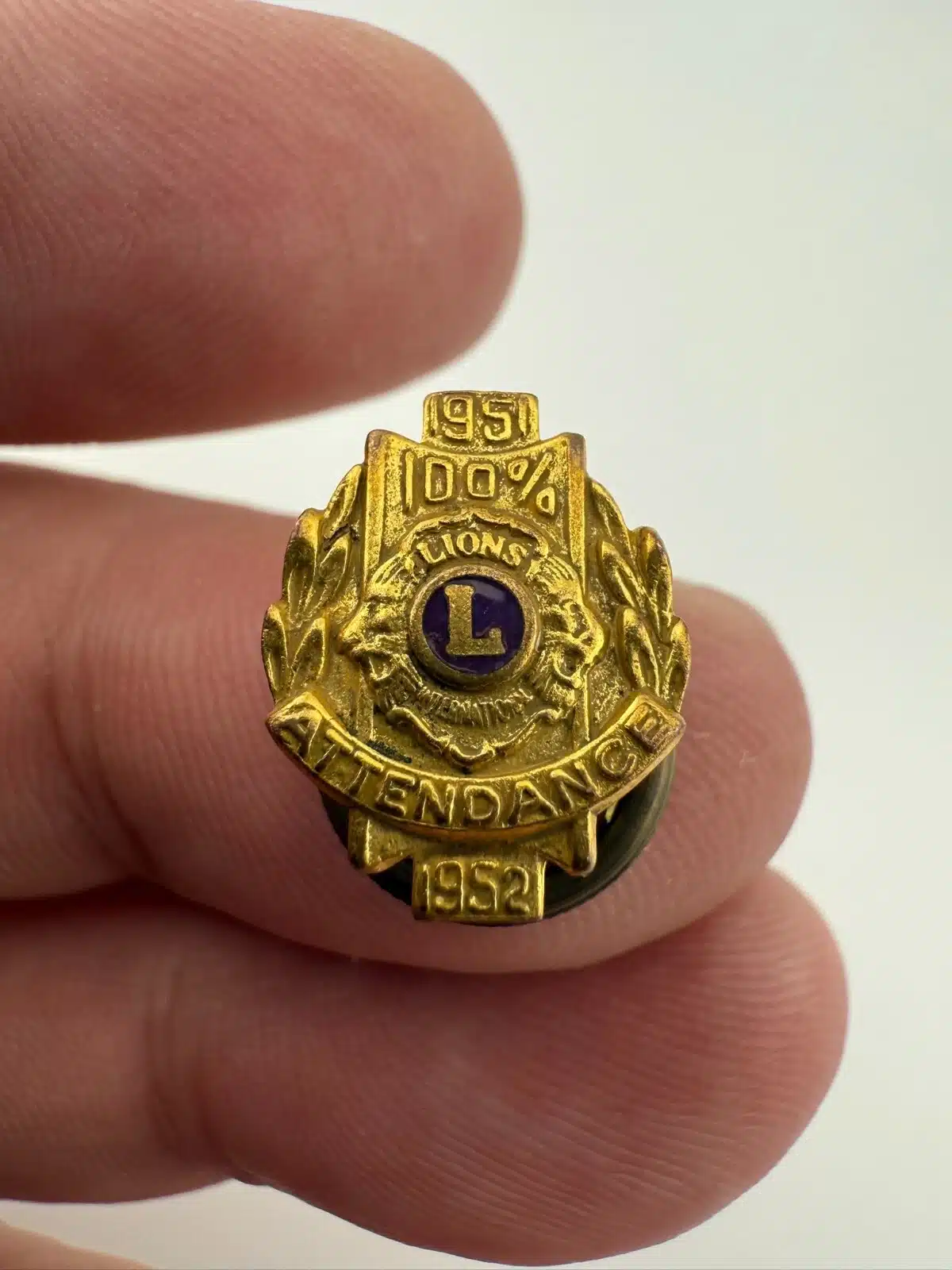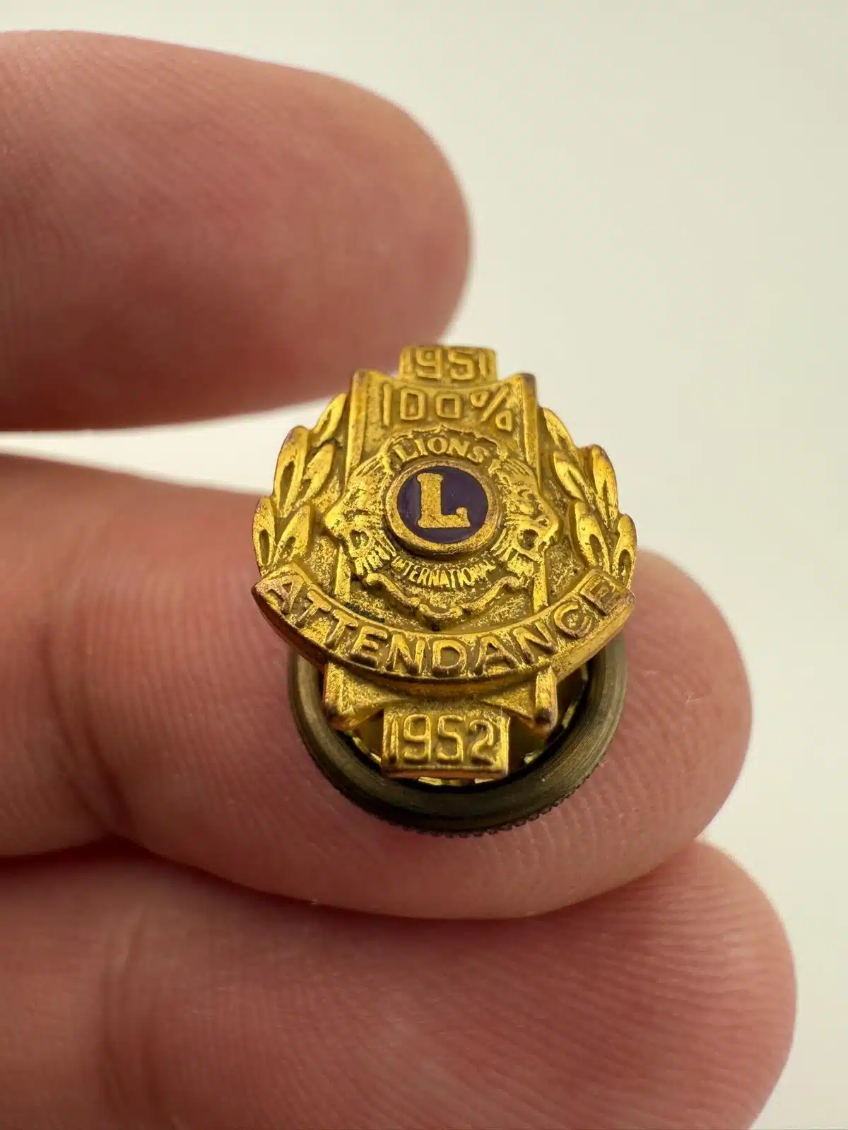 1951-1952 Lions Club Screwback Pin – 100% Attendance – By Leavens MFG MASS