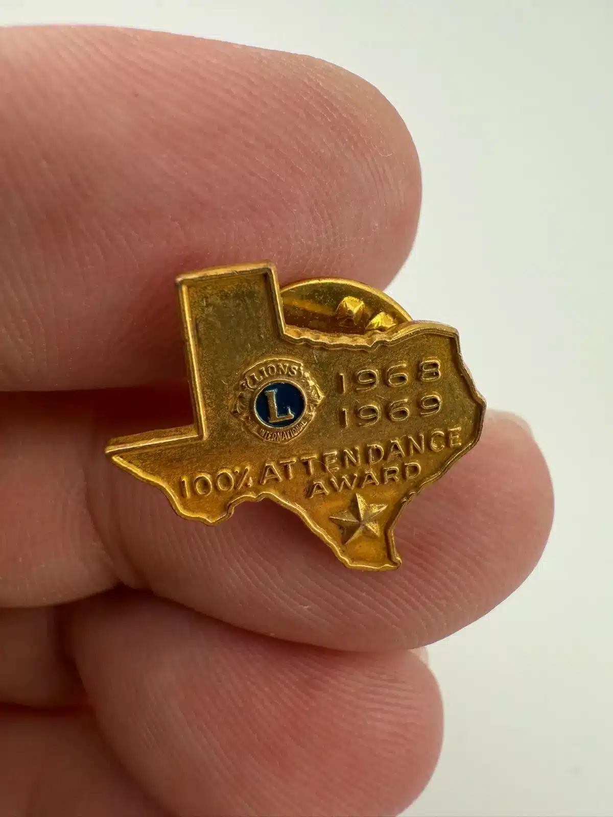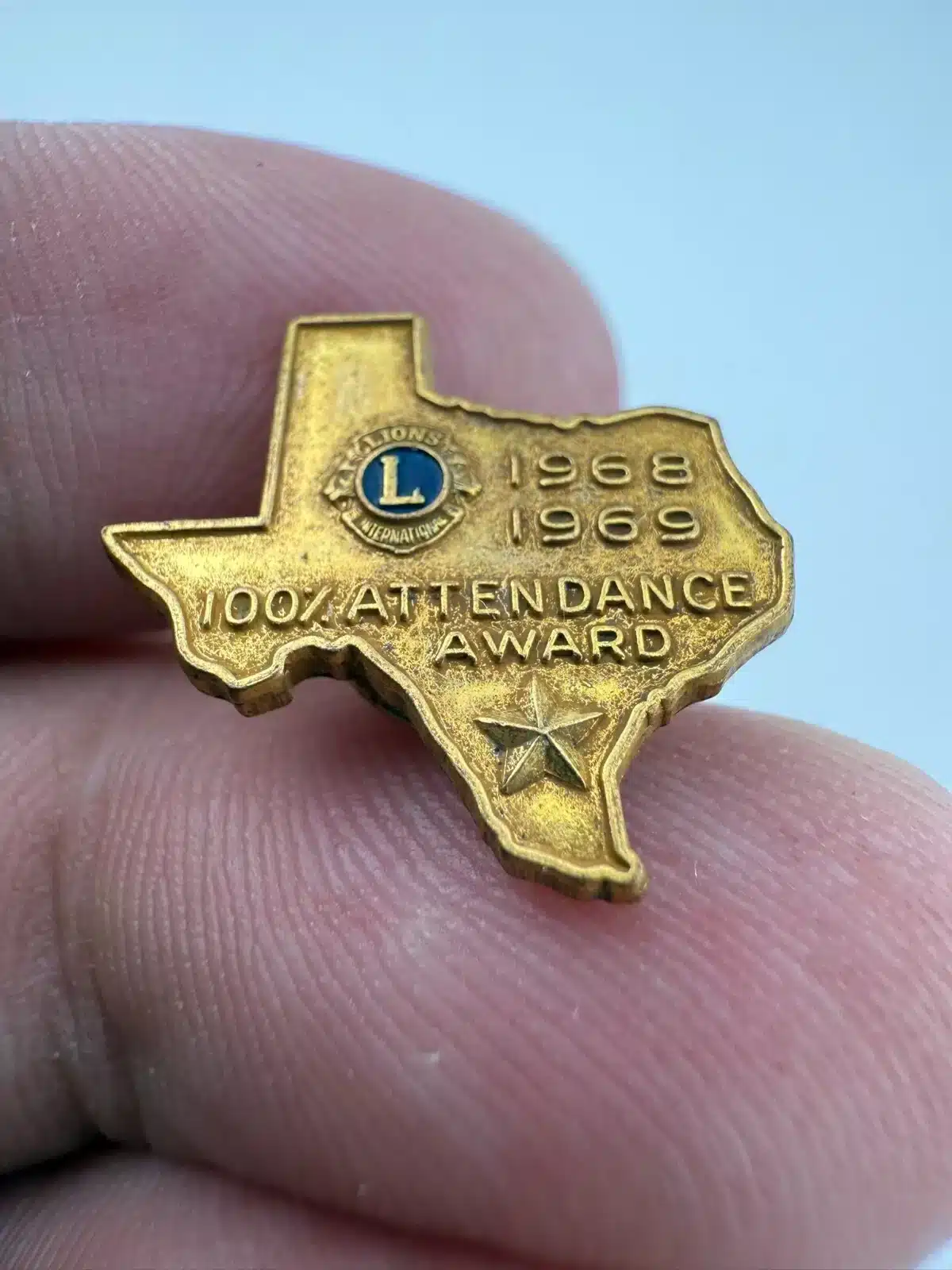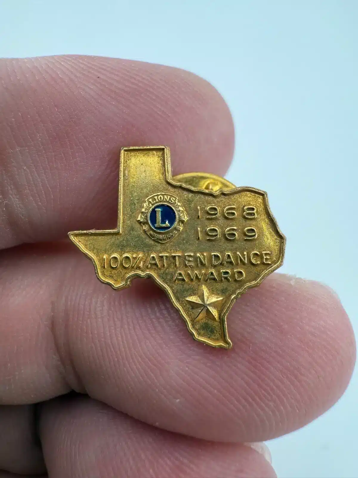1968-1969 Texas Lions Club Pin – 100% Attendance Award – By David Evans