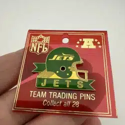 This pin features the iconic New York Jets helmet logo, showcasing the team’s distinctive green and white color scheme. Created by Peter David in 1984, it represents a significant era in the franchise’s history.