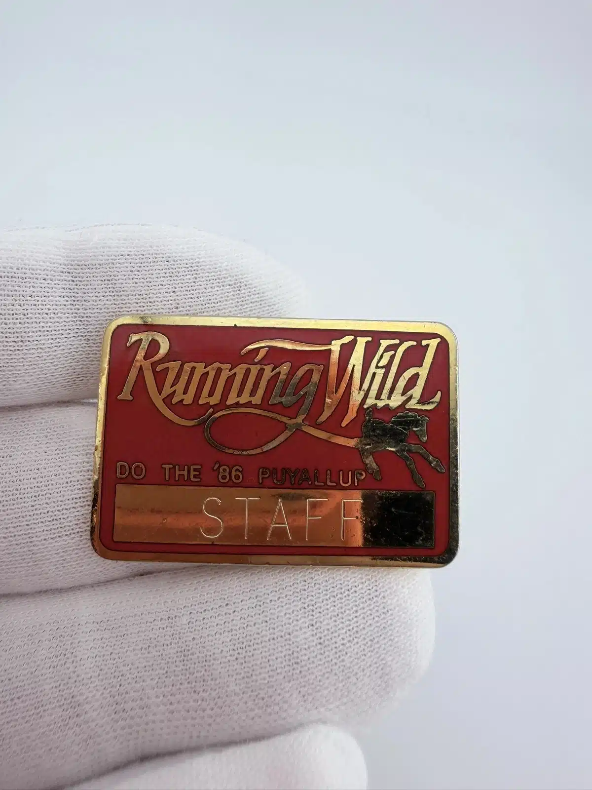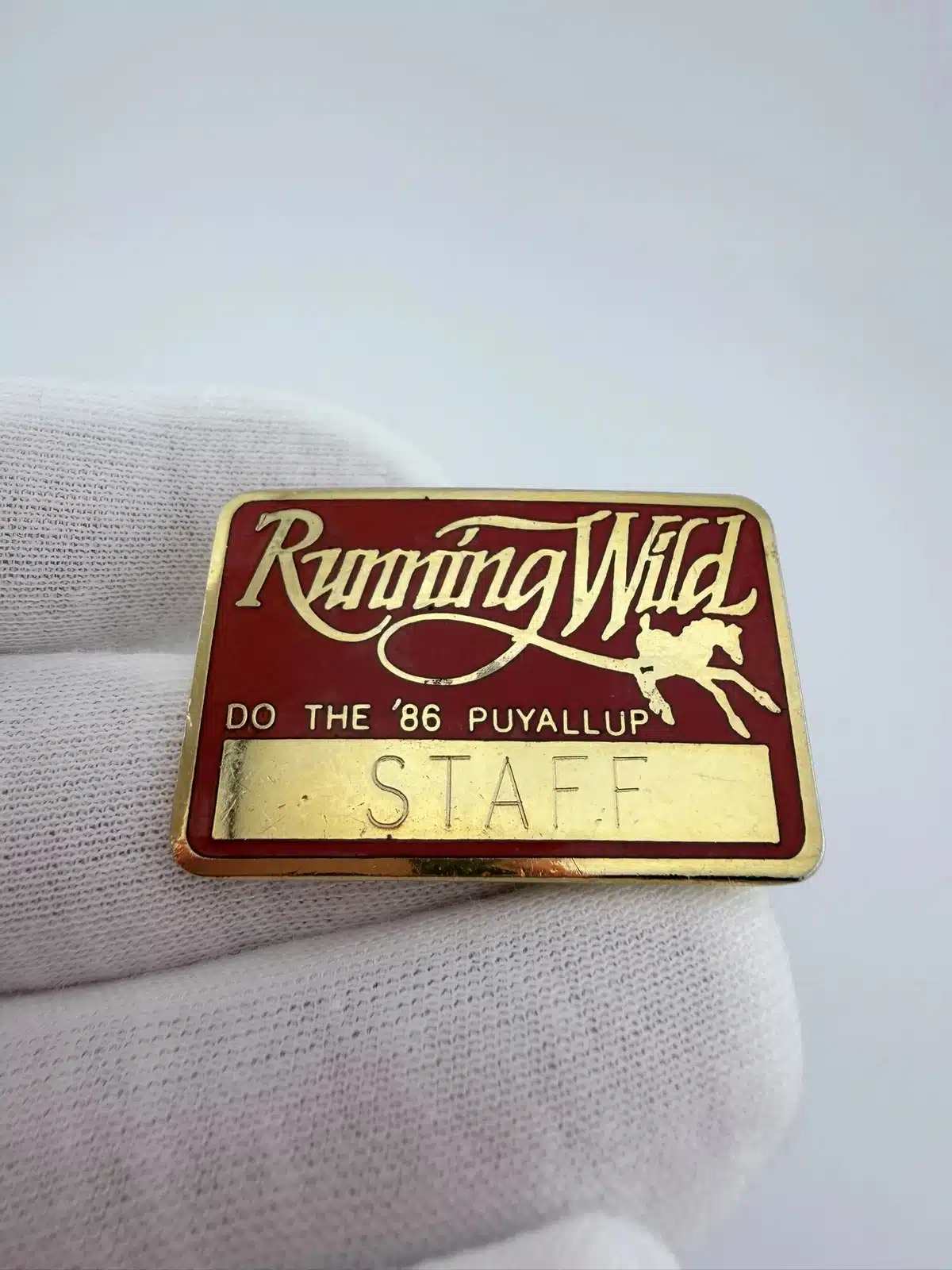 This 1986 Puyallup Fair staff pin features the phrase “Running Wild” in an elegant cursive font, with the tail of the “g” artistically flowing into the silhouette of a running horse. The creative transition from lettering to imagery gives the design a sense of motion and ties directly into the fair’s equestrian themes.