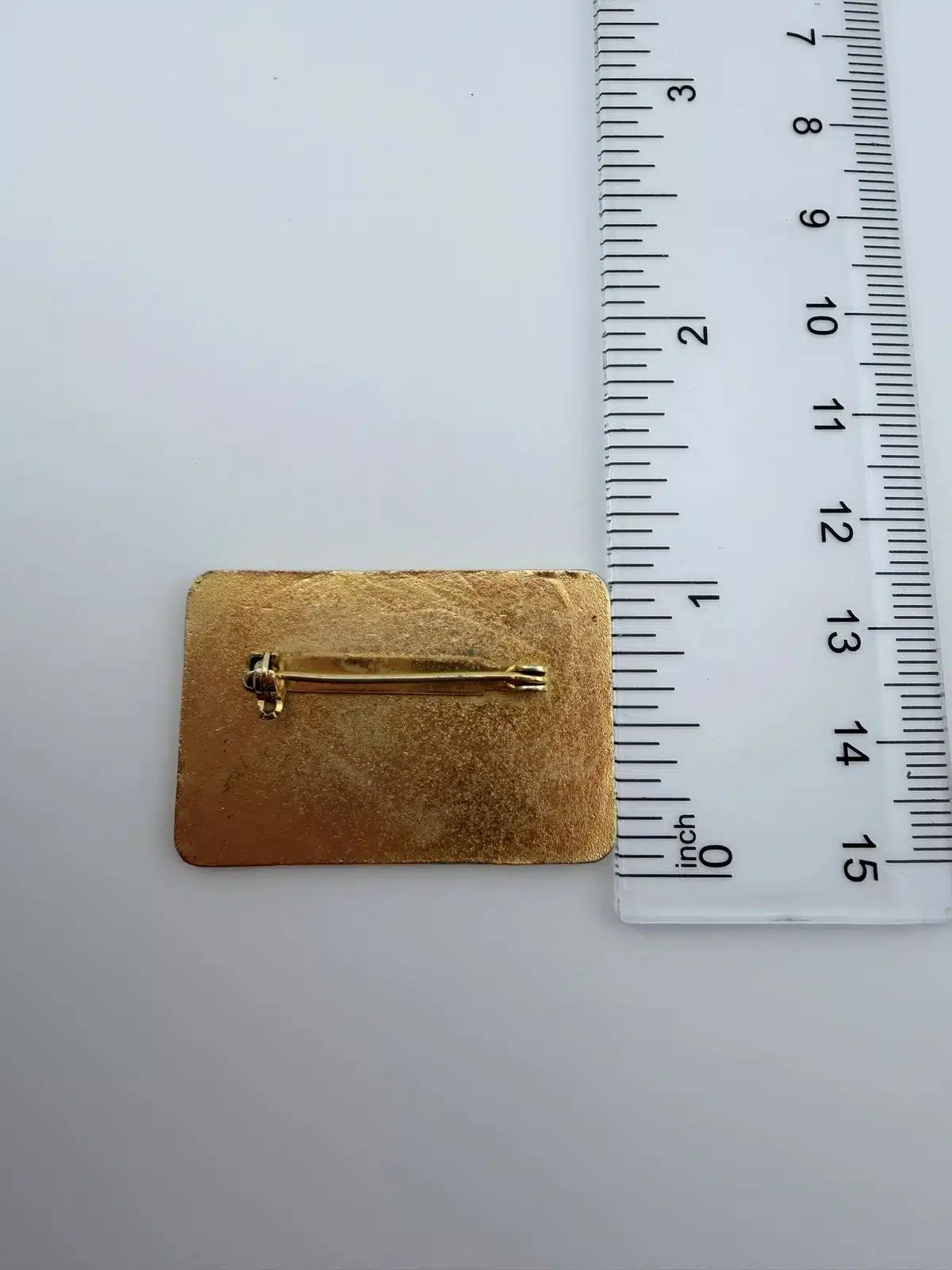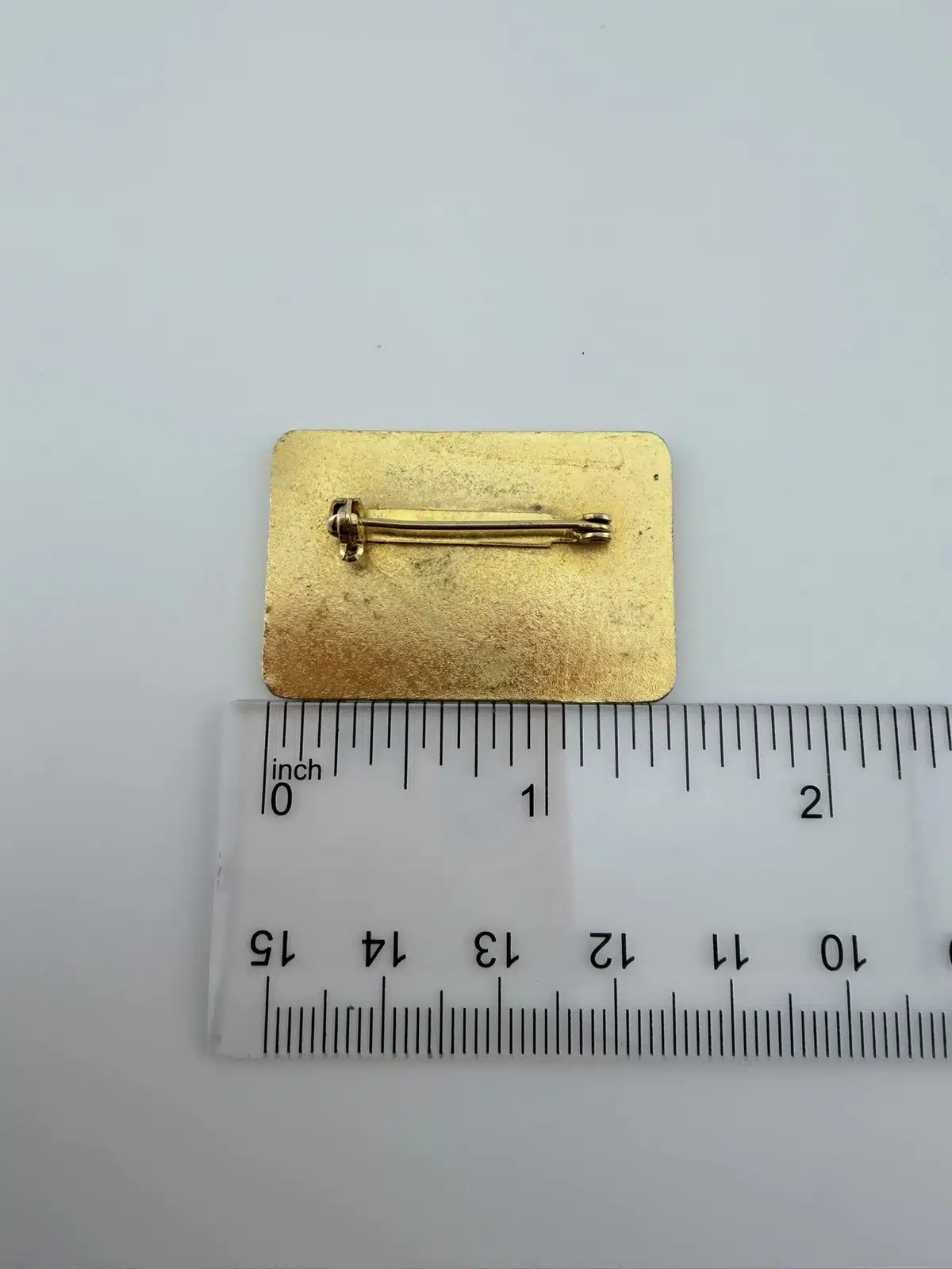 Measuring approximately 1.5 inches wide by 1 inch tall, the pin has a classic horizontal layout and stands out as a distinctive staff item.