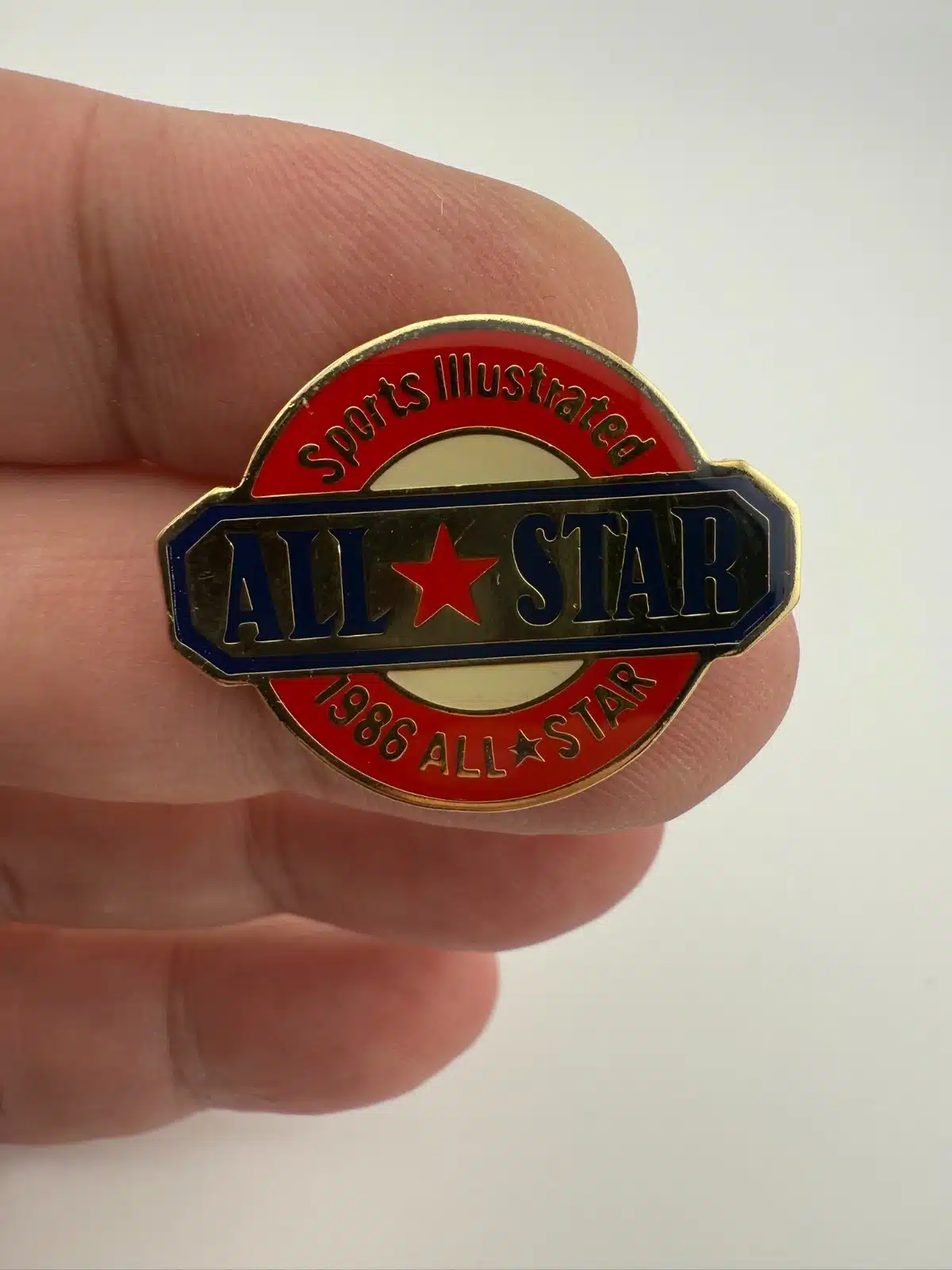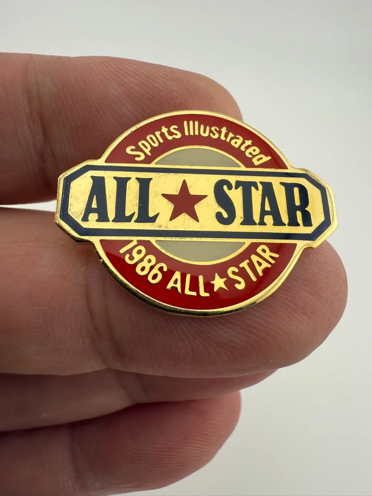 Featuring a horizontal layout, this pin displays the words “All Star” with a red star positioned between them. Above is the text “Sports Illustrated,” while below it reads “1986 All Star” with another star separating the words, creating a layered, event-style design.