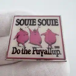 This vibrant 1989 Puyallup Fair pin features a playful pink pig in mid-spin, capturing the lively and lighthearted spirit of the fair. The phrase “Souie Souie” is prominently displayed above the dancing pig, with “Do the Puyallup” positioned along the bottom, celebrating the event’s fun and festive atmosphere.