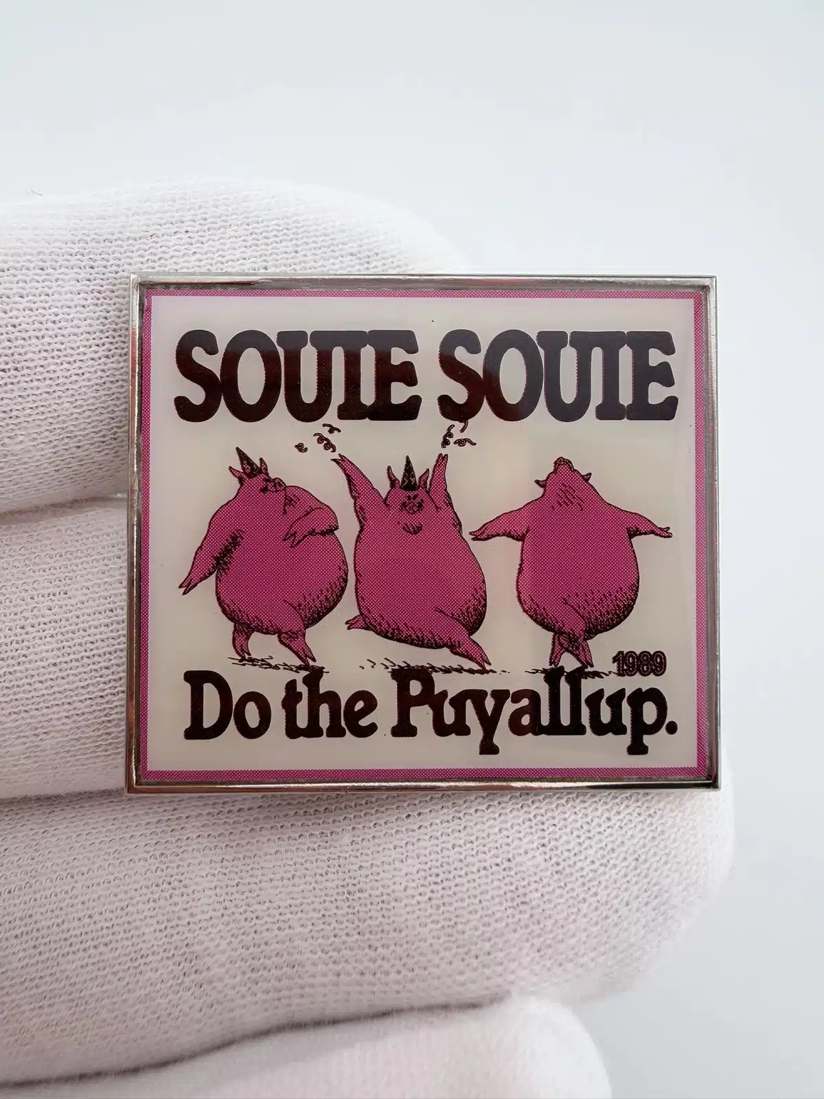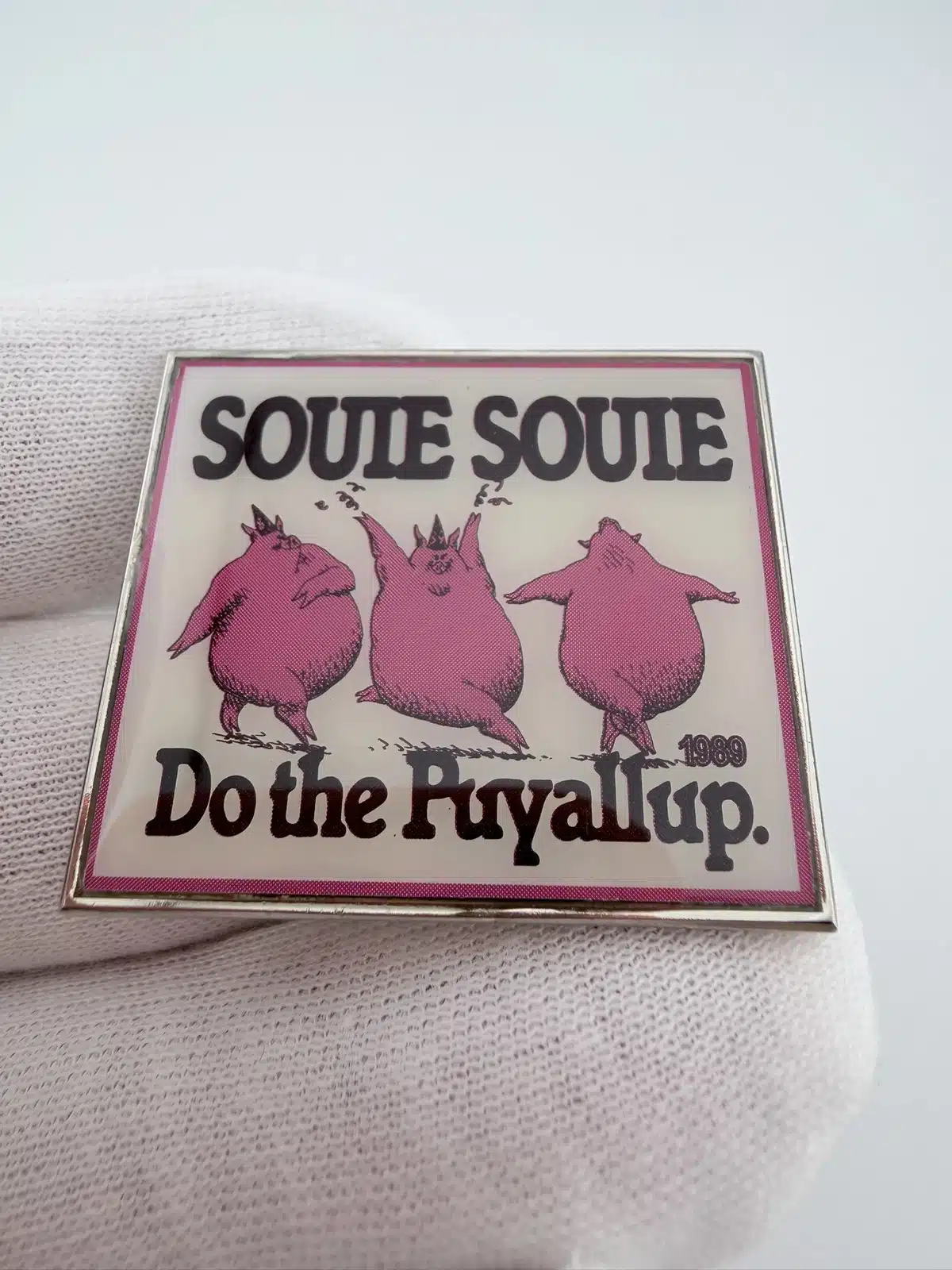 This vibrant 1989 Puyallup Fair pin features a playful pink pig in mid-spin, capturing the lively and lighthearted spirit of the fair. The phrase “Souie Souie” is prominently displayed above the dancing pig, with “Do the Puyallup” positioned along the bottom, celebrating the event’s fun and festive atmosphere.