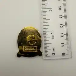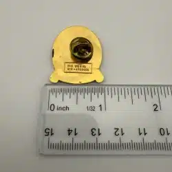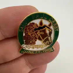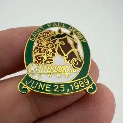 This pin features a horse racing themed design with “Saint Paul Derby” across the top. At the center is a horse head with a bouquet of roses around its neck, referencing the traditional garland presented to race winners. Beneath the horse appears the text “Canterbury Downs”, while the bottom reads “June 25th 1989”. Pin measures approximately 1 inch in width by 1.25 inches in height.