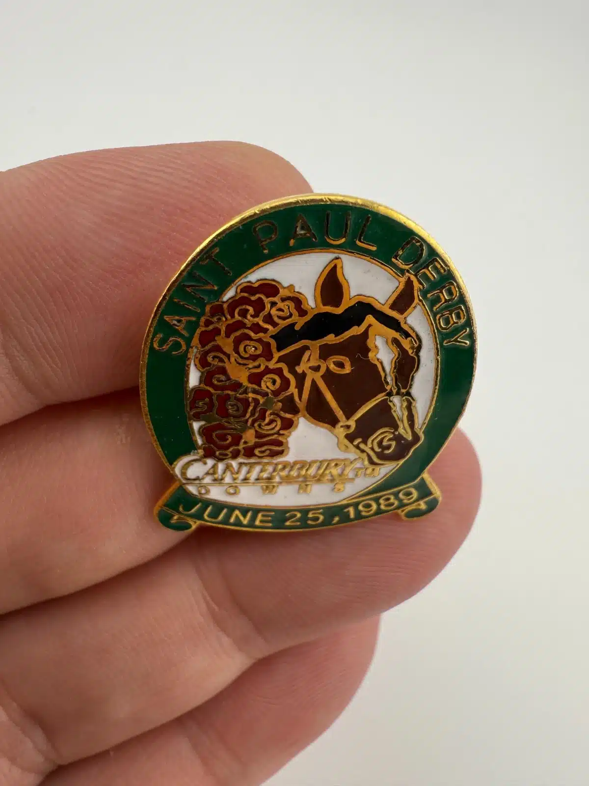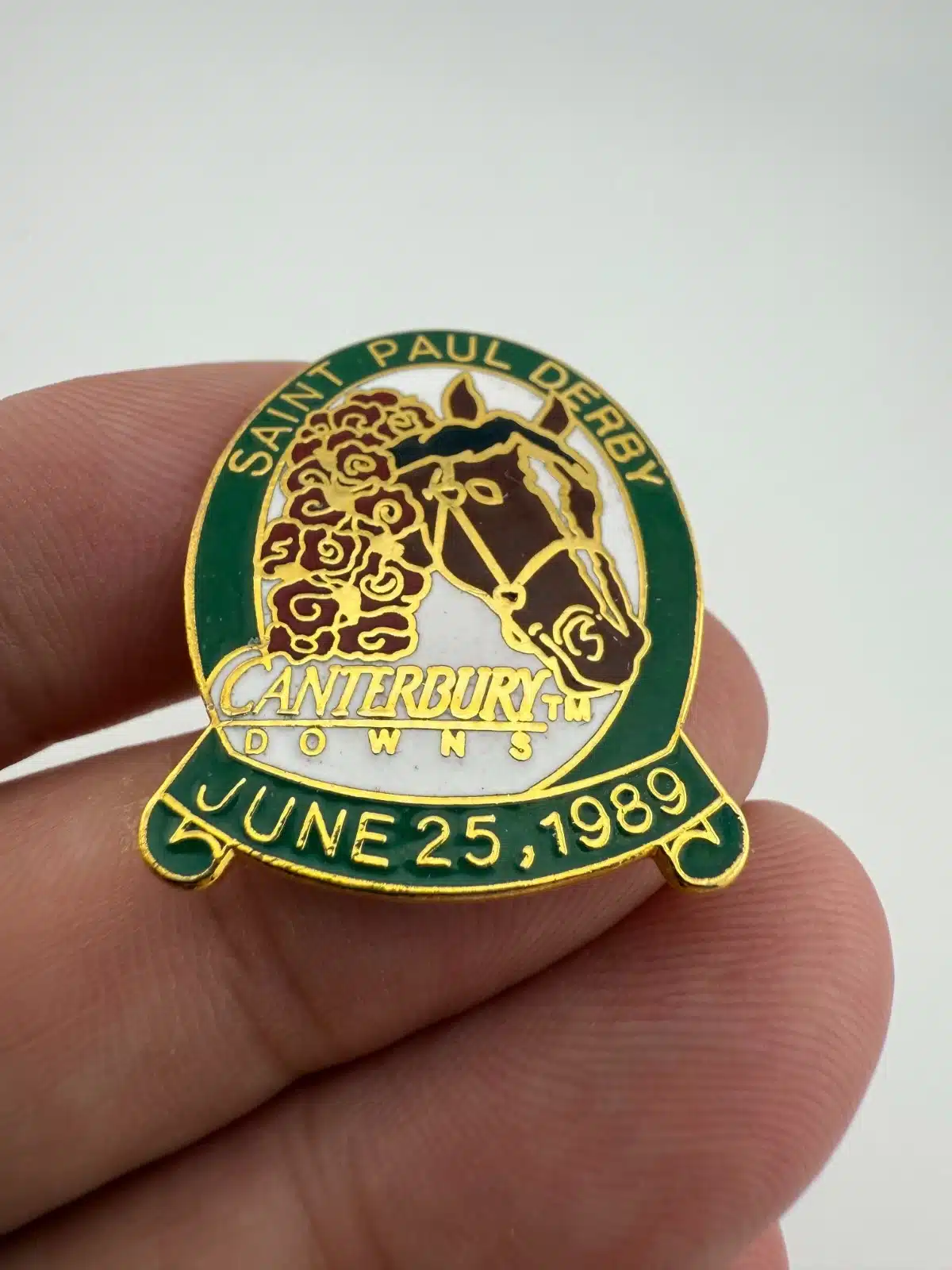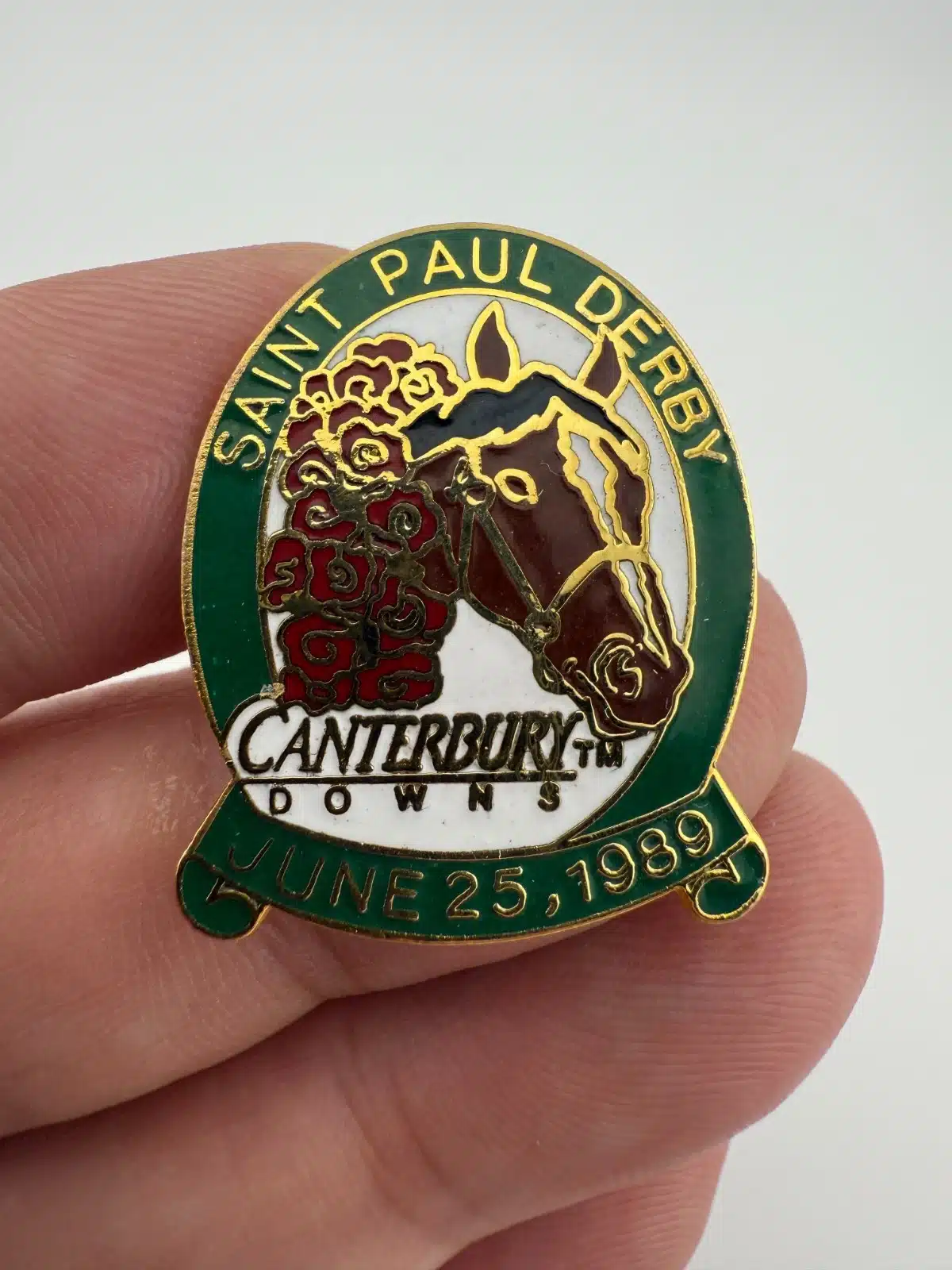 This pin features a horse racing themed design with “Saint Paul Derby” across the top. At the center is a horse head with a bouquet of roses around its neck, referencing the traditional garland presented to race winners. Beneath the horse appears the text “Canterbury Downs”, while the bottom reads “June 25th 1989”. Pin measures approximately 1 inch in width by 1.25 inches in height.