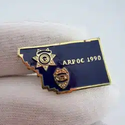 This pin is shaped like the state of Montana and features a blue background with two police badges on the left side. On the right, it displays the acronym ARPOC alongside the year 1990, creating a balanced law enforcement-themed layout.