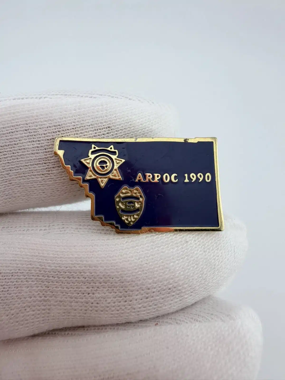 This pin is shaped like the state of Montana and features a blue background with two police badges on the left side. On the right, it displays the acronym ARPOC alongside the year 1990, creating a balanced law enforcement-themed layout.