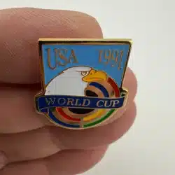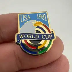 The 1991 USA World Cup Soccer pin features ‘USA 1991’ prominently at the top, with an eagle design below that holds a World Cup banner. This pin commemorates the inaugural women’s World Cup held in the United States.