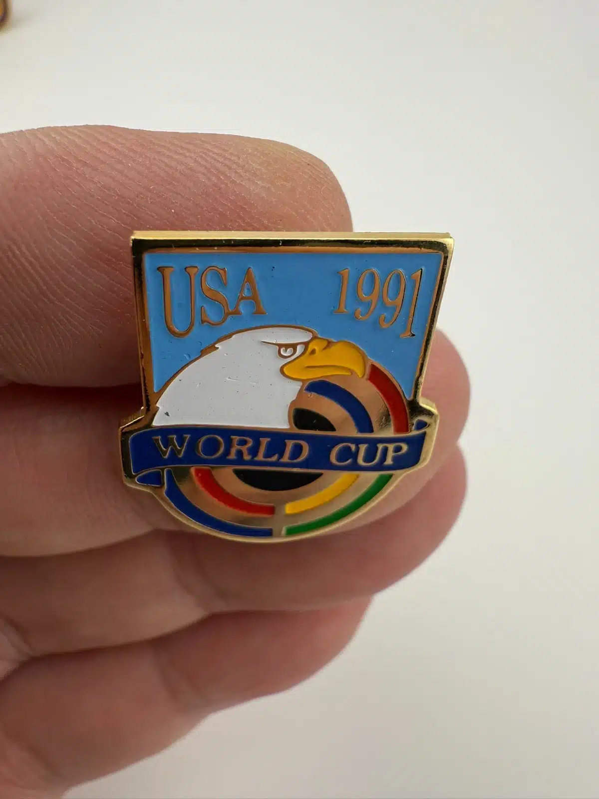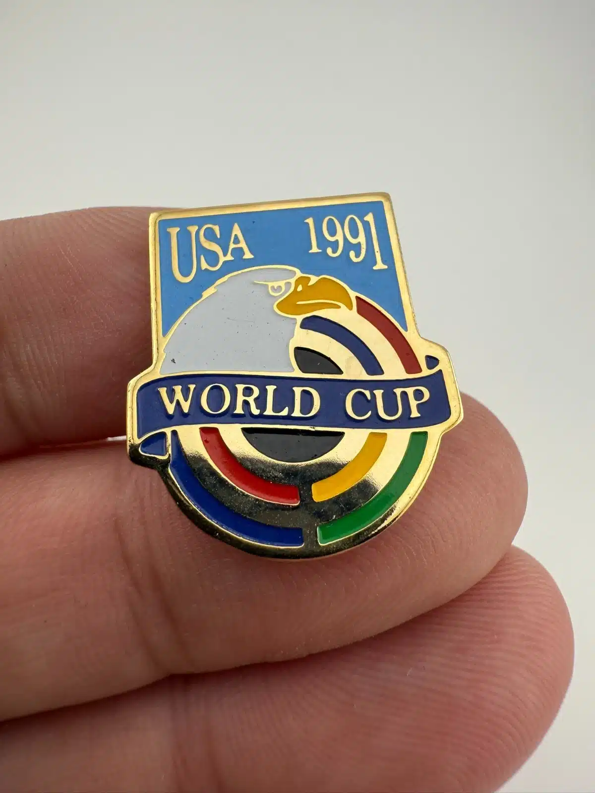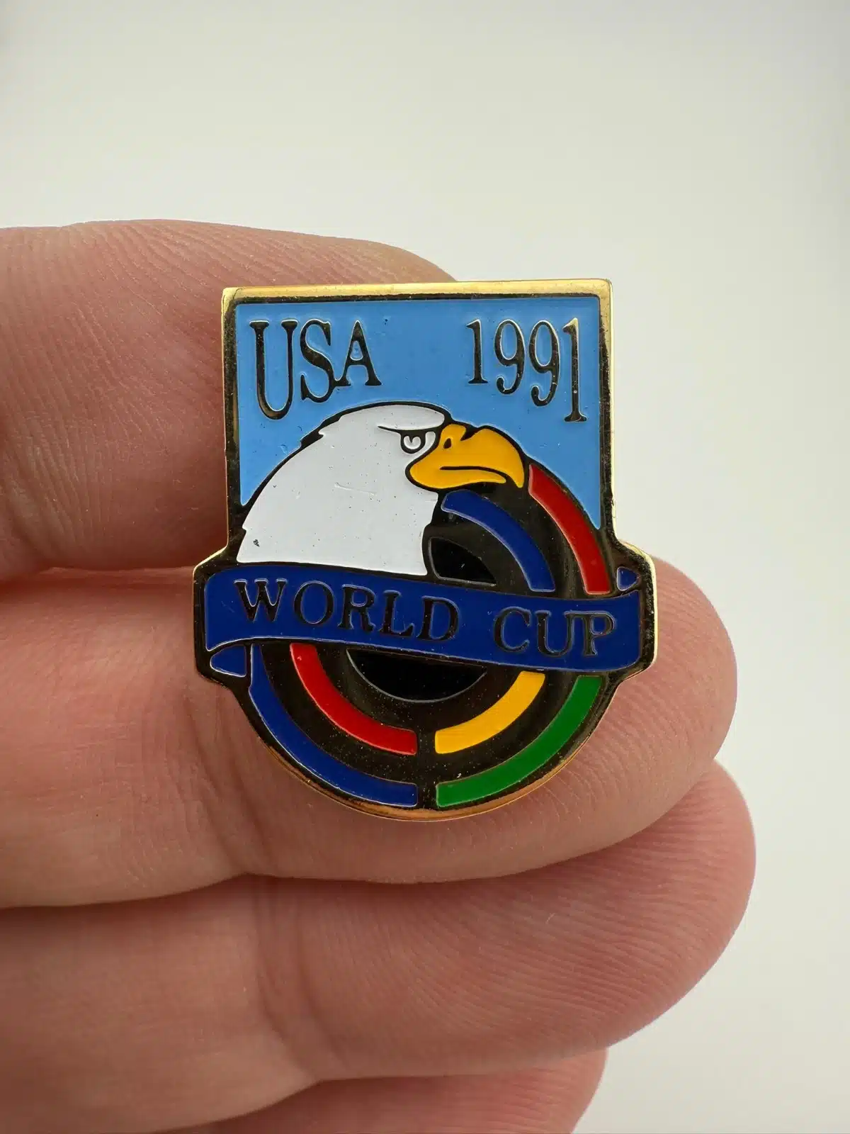 The 1991 USA World Cup Soccer pin features ‘USA 1991’ prominently at the top, with an eagle design below that holds a World Cup banner. This pin commemorates the inaugural women’s World Cup held in the United States.