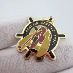 This vibrant lapel pin features a striking red and yellow hydroplane bursting out of a captain’s wheel, symbolizing the excitement of the Seattle Seafair. The design captures the spirit of this annual event, which celebrates hydroplane racing and maritime culture in Seattle since 1950.