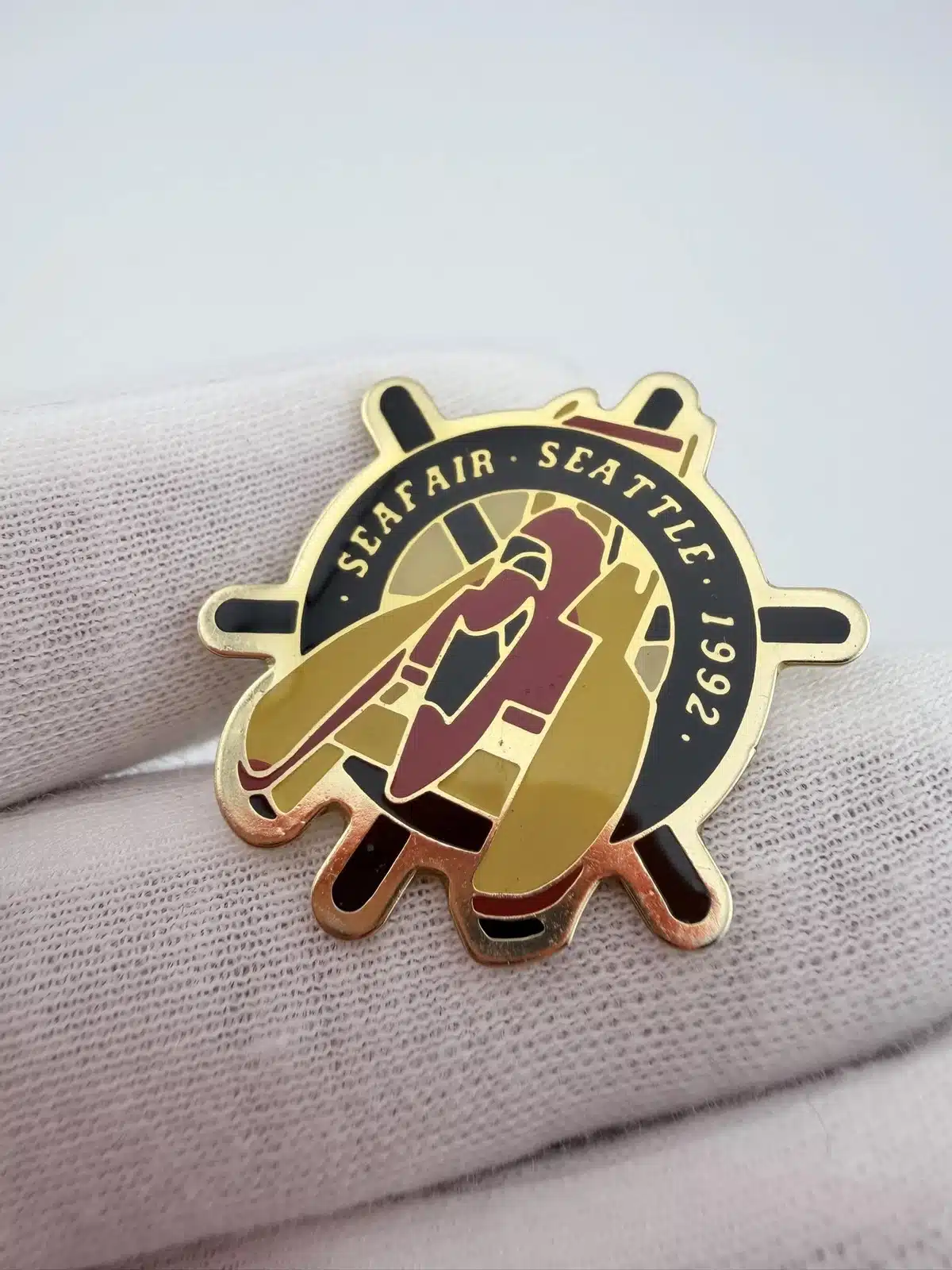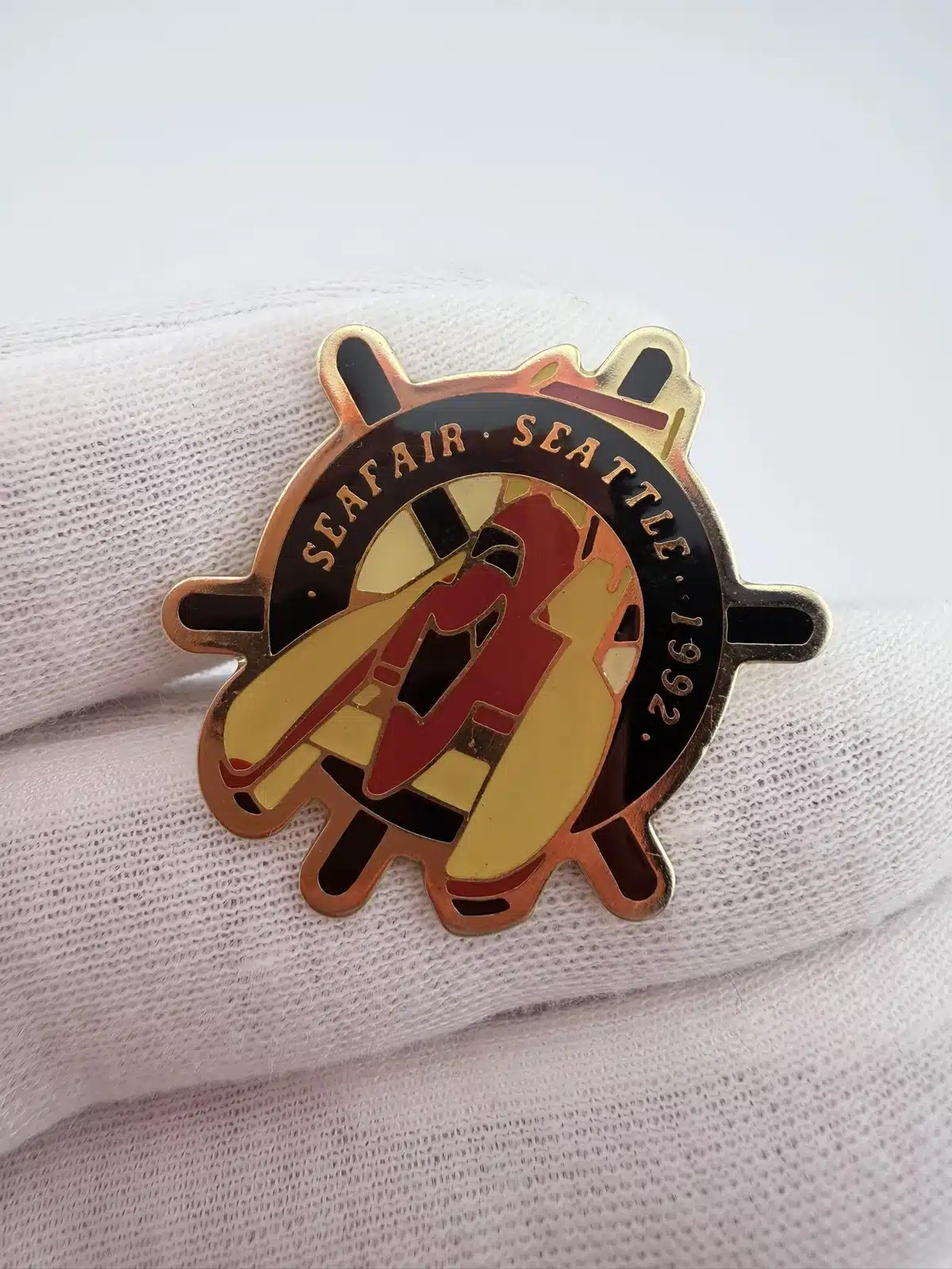 This vibrant lapel pin features a striking red and yellow hydroplane bursting out of a captain’s wheel, symbolizing the excitement of the Seattle Seafair. The design captures the spirit of this annual event, which celebrates hydroplane racing and maritime culture in Seattle since 1950.