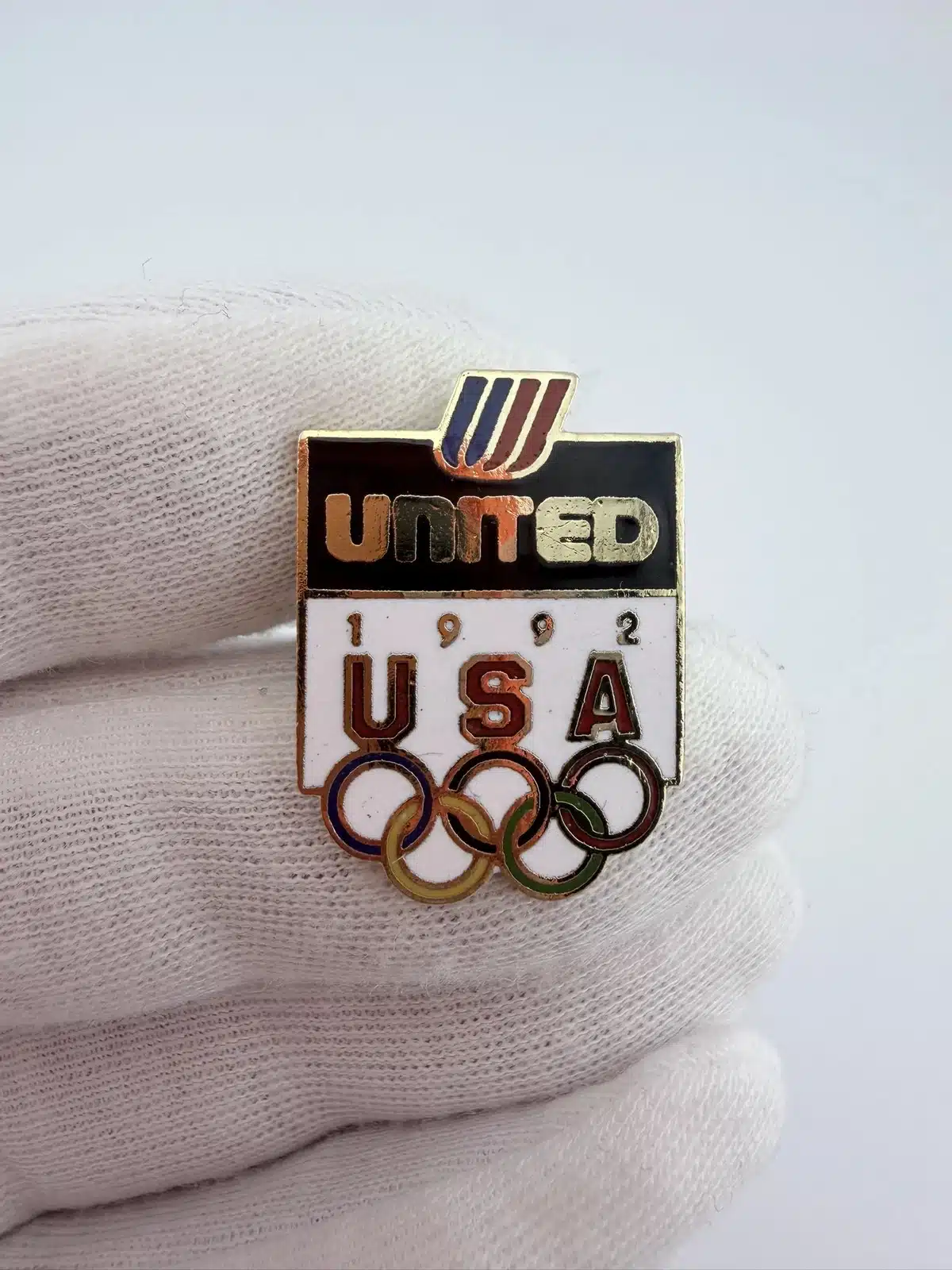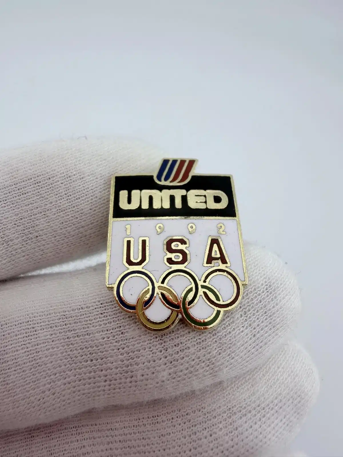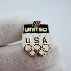 This 1992 United Airlines USA Olympics pin features the iconic United Airlines Tulip logo prominently at the top, with ‘UNITED’ displayed below it. The design is completed with ‘1992 USA’ and the Olympic rings, symbolizing the partnership between the airline and the Olympic Games held in Barcelona. The pin is 3/4 an inch in width and 1 inch in height.