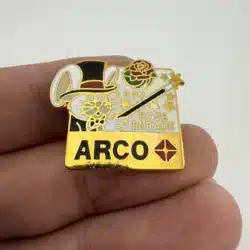 This 1993 Rose Parade pin from ARCO features a whimsical bunny dressed as a magician, complete with a classic magician’s hat and a wand, surrounded by sparkling stars. The design captures the festive spirit of the parade, celebrating the creativity and artistry associated with this iconic event.