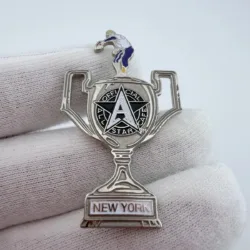 This pin features a tall trophy design with the All Star Cafe logo displayed on the body. At the top of the trophy is a baseball pitcher in a throwing pose, and at the bottom it reads “New York.”