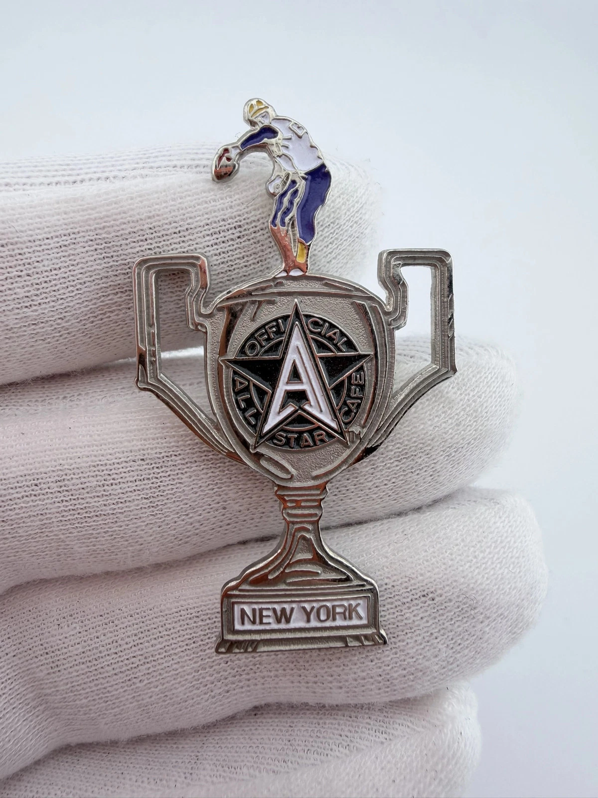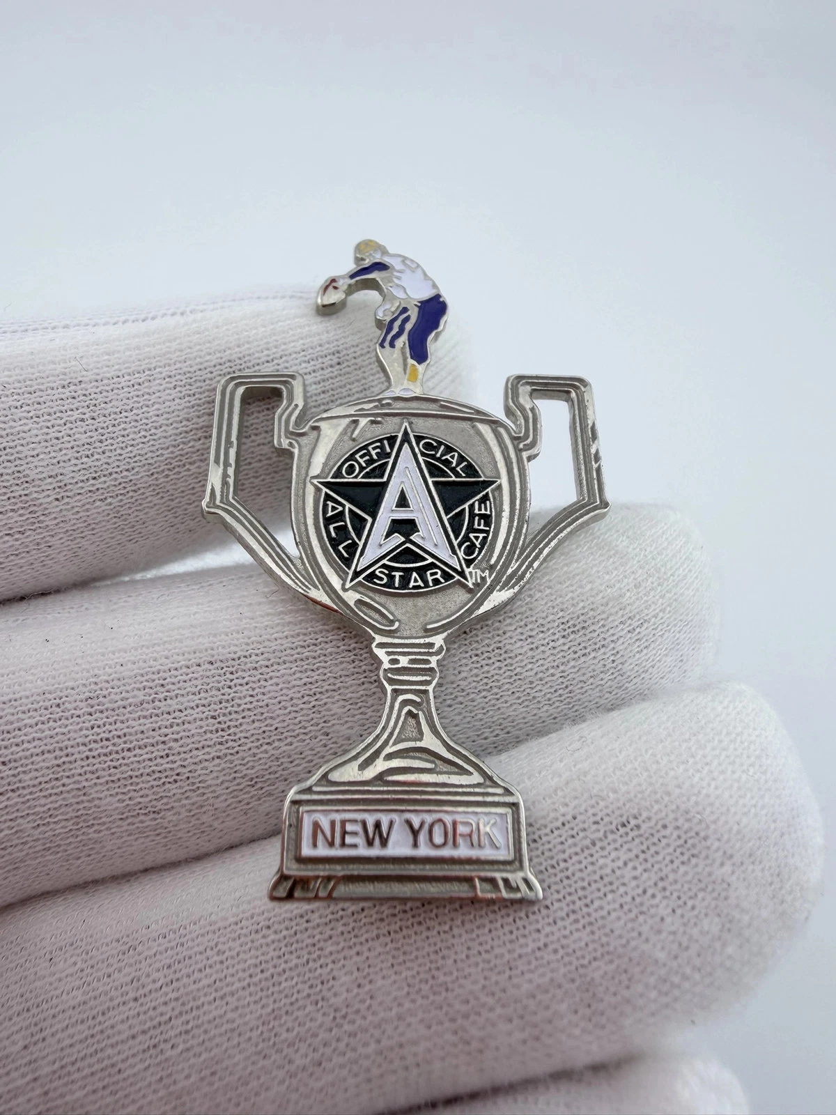 This pin features a tall trophy design with the All Star Cafe logo displayed on the body. At the top of the trophy is a baseball pitcher in a throwing pose, and at the bottom it reads “New York.”