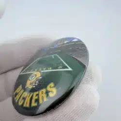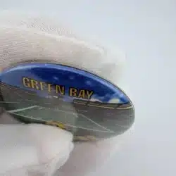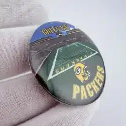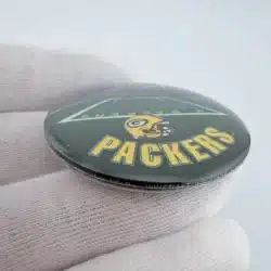 This 1996 NFLP Green Bay Packers pinback button features a detailed layout of the stadium and field, with ‘Green Bay’ prominently displayed at the top and ‘Packers’ at the bottom. Below the field, the iconic Packers football helmet adds a distinctive touch, celebrating the team’s rich history and fan loyalty.