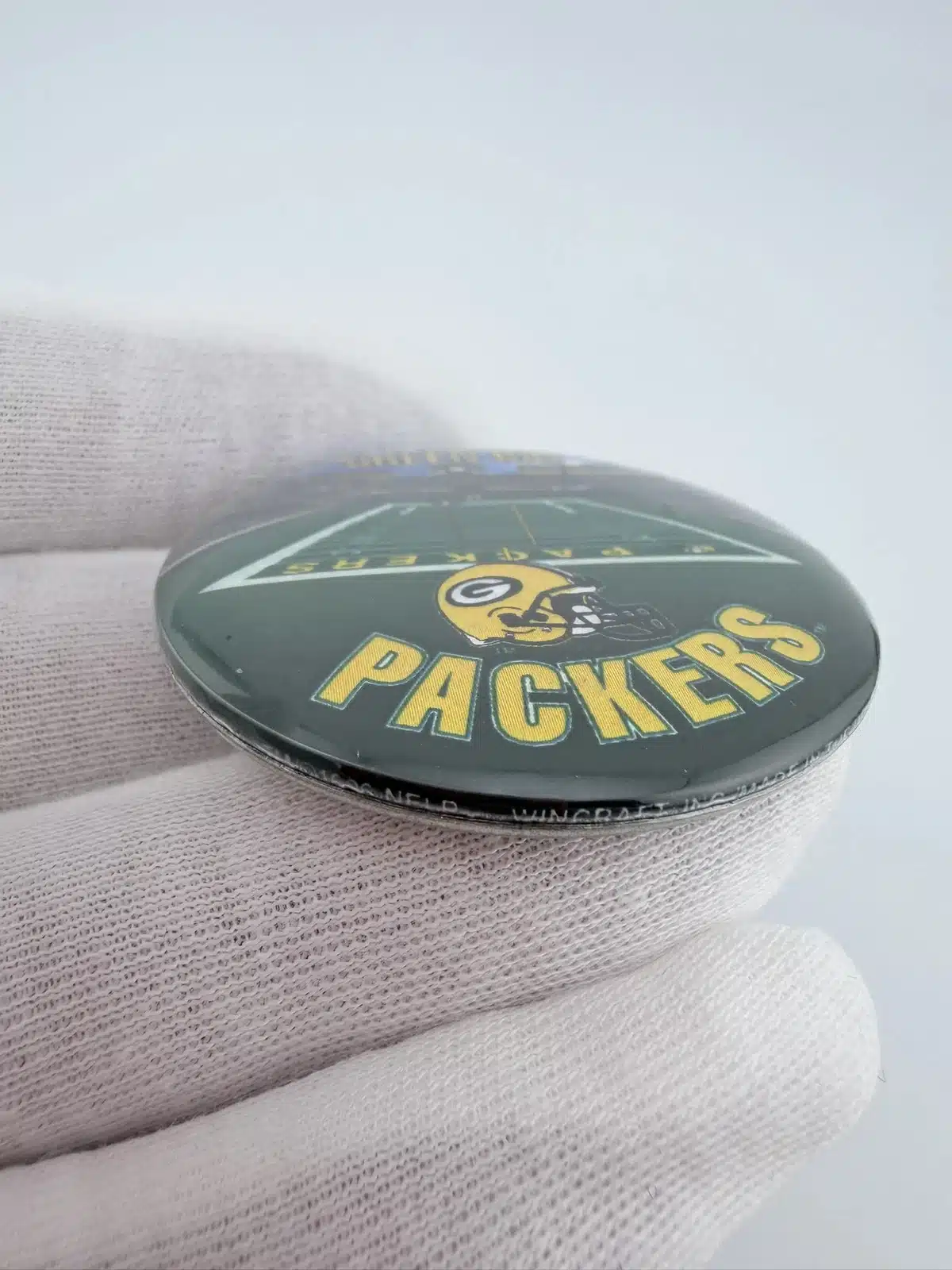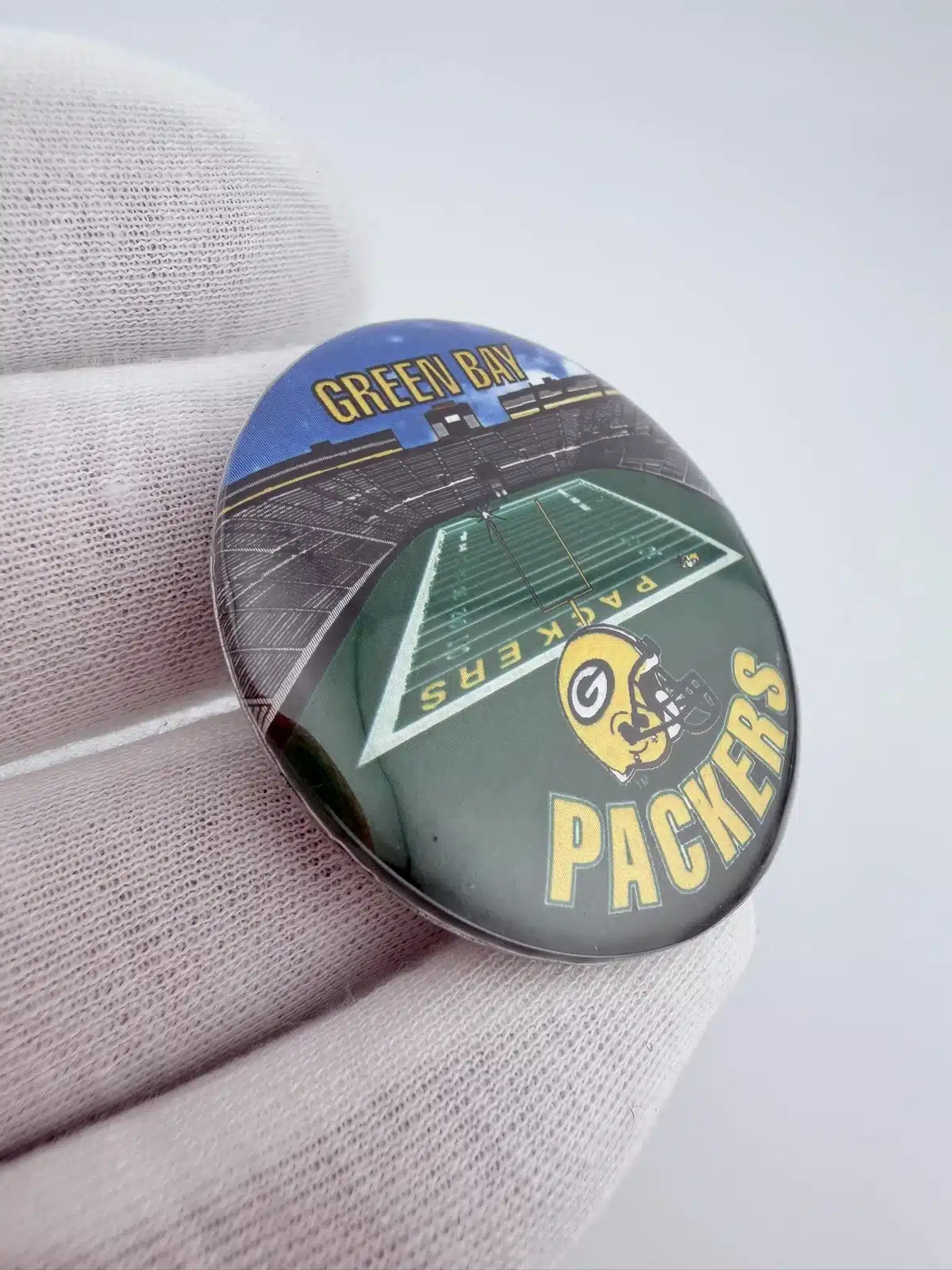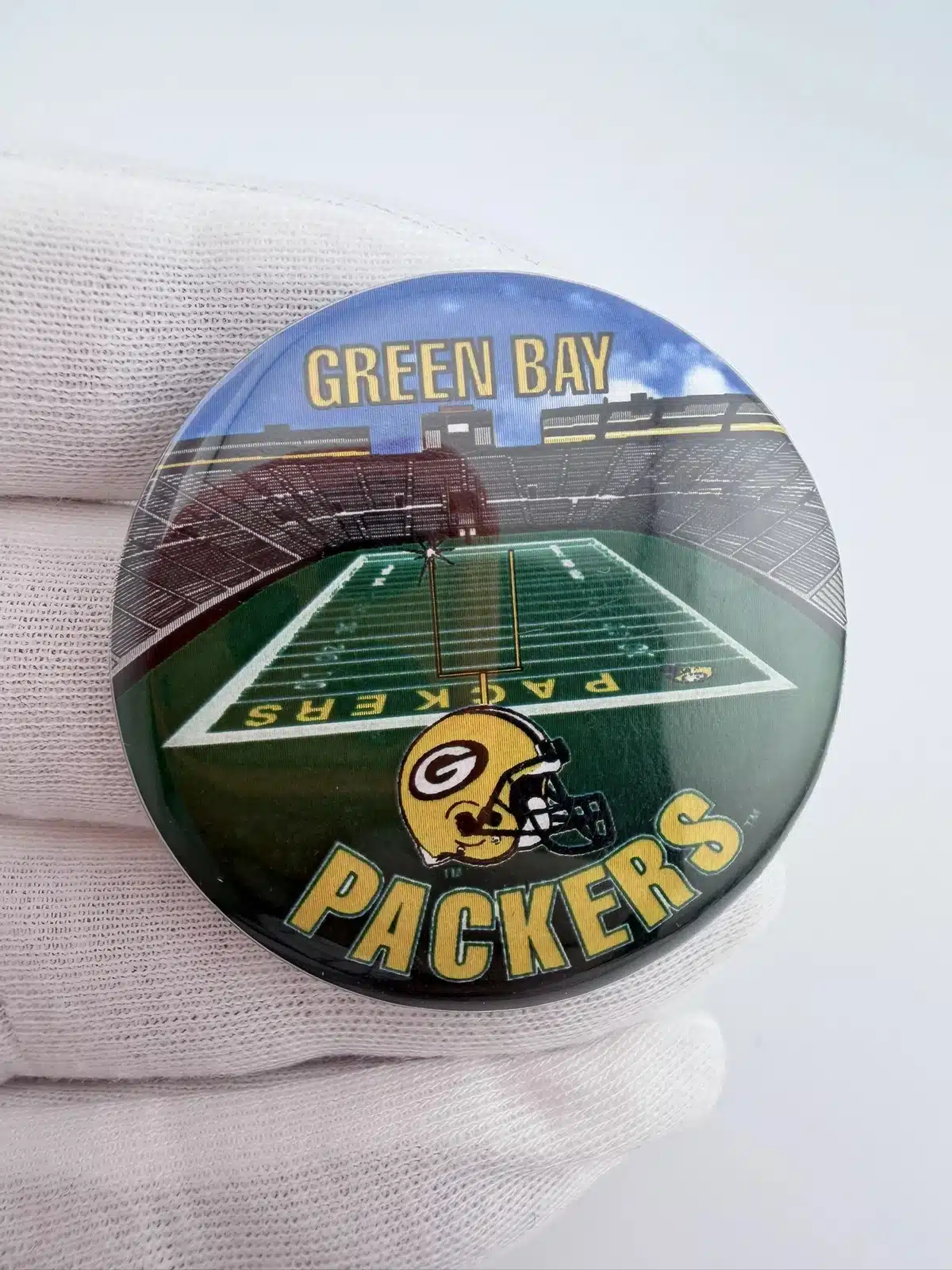 This 1996 NFLP Green Bay Packers pinback button features a detailed layout of the stadium and field, with ‘Green Bay’ prominently displayed at the top and ‘Packers’ at the bottom. Below the field, the iconic Packers football helmet adds a distinctive touch, celebrating the team’s rich history and fan loyalty.