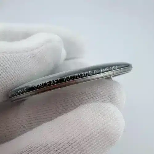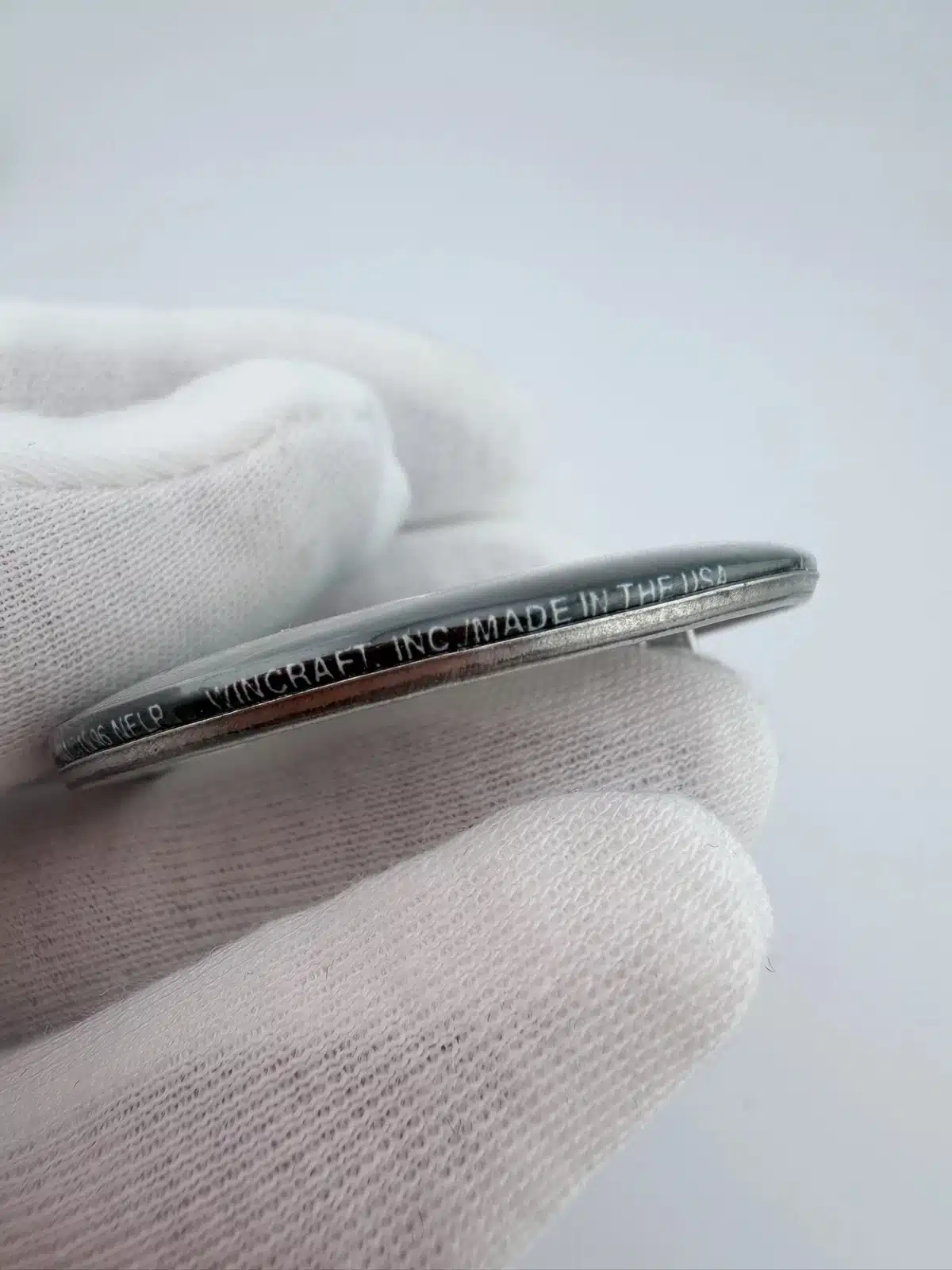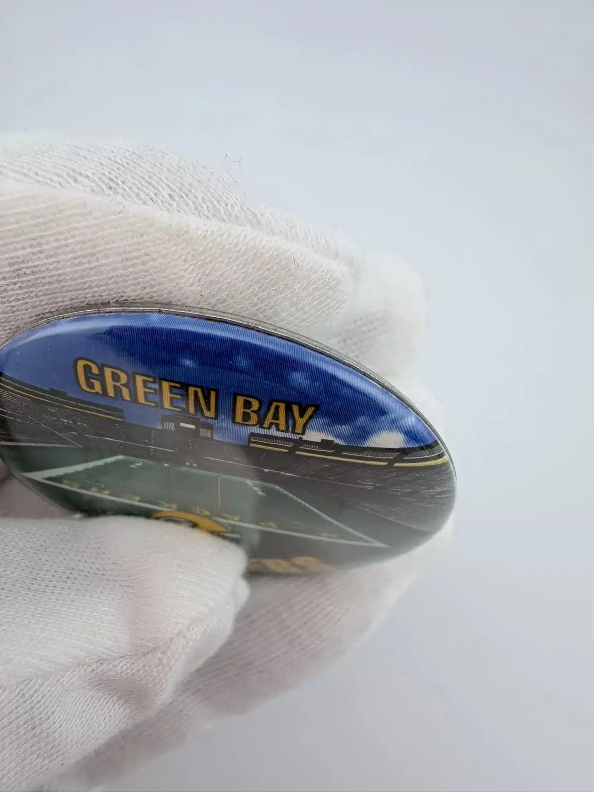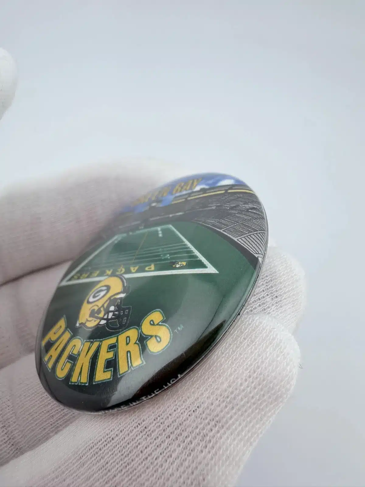 This 1996 NFLP Green Bay Packers pinback button features a detailed layout of the stadium and field, with ‘Green Bay’ prominently displayed at the top and ‘Packers’ at the bottom. Below the field, the iconic Packers football helmet adds a distinctive touch, celebrating the team’s rich history and fan loyalty.