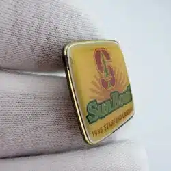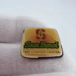 This 1996 Northwest Sun Bowl pin commemorates the matchup between the Stanford Cardinal and the Michigan State Spartans. The square design features Stanford’s block “S” in red with the green tree layered over it, representing the university’s distinctive athletic branding.