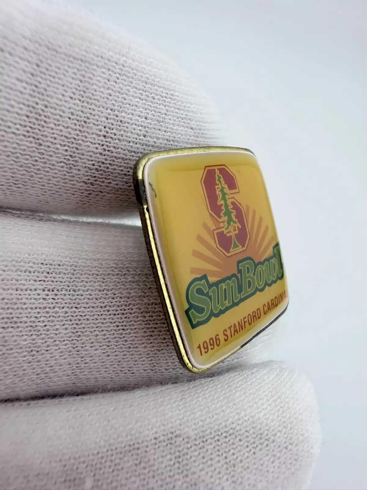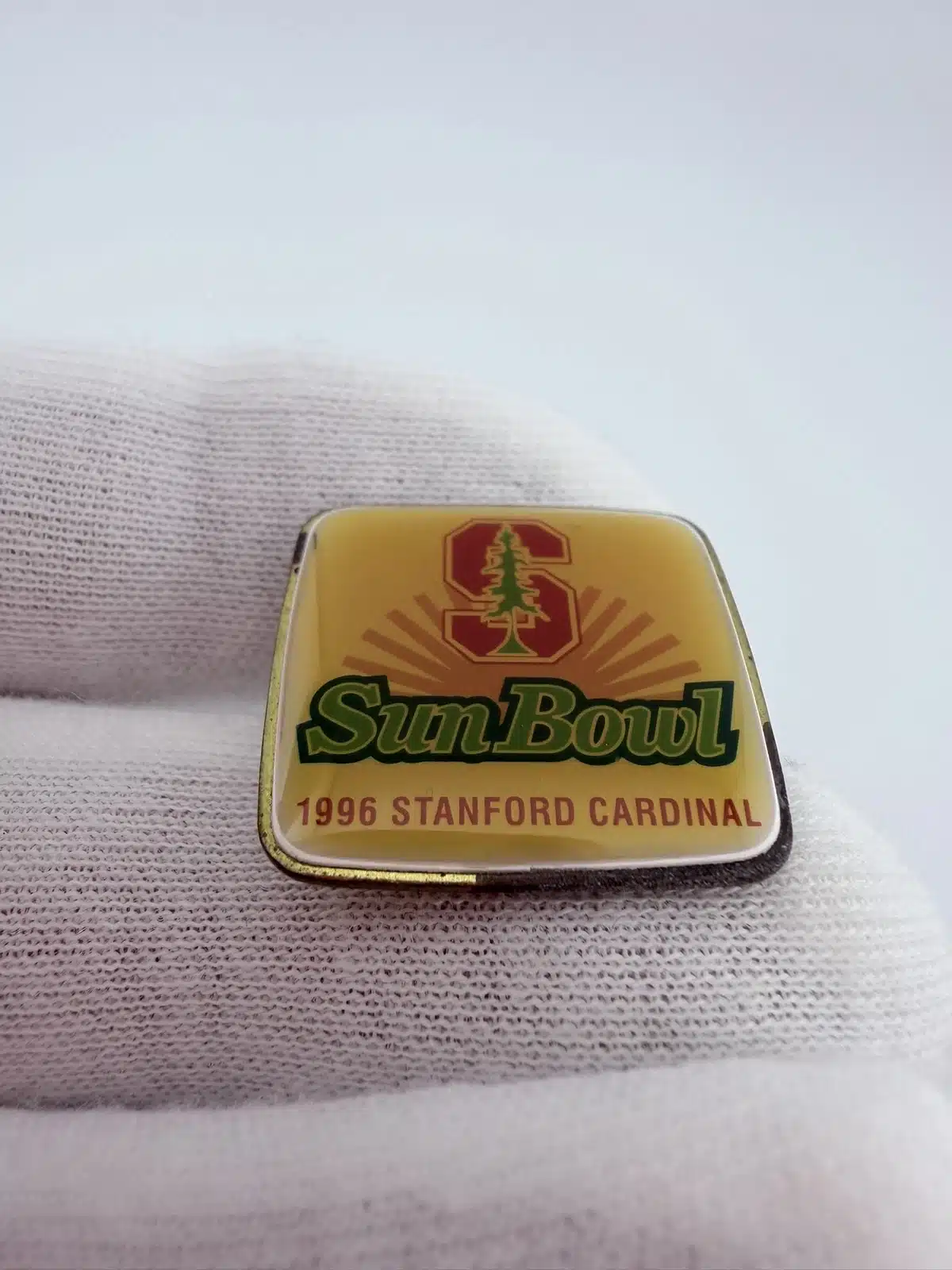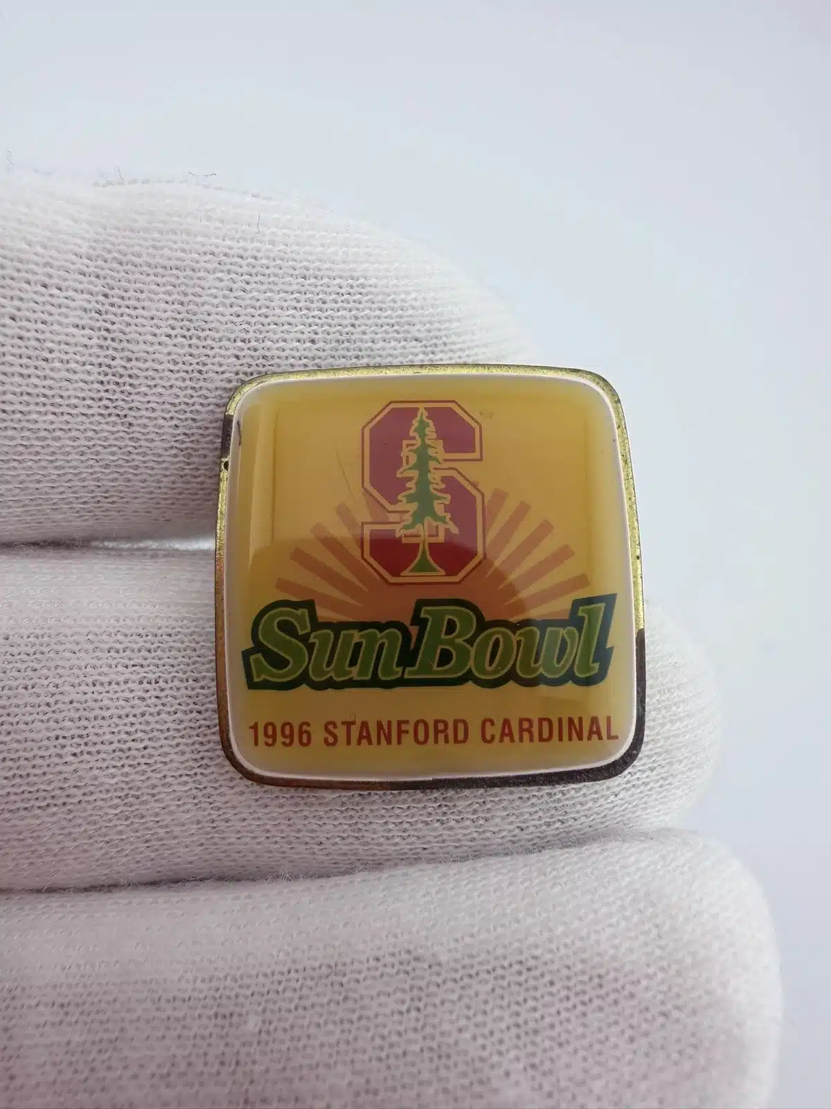 This 1996 Northwest Sun Bowl pin commemorates the matchup between the Stanford Cardinal and the Michigan State Spartans. The square design features Stanford’s block “S” in red with the green tree layered over it, representing the university’s distinctive athletic branding.