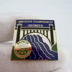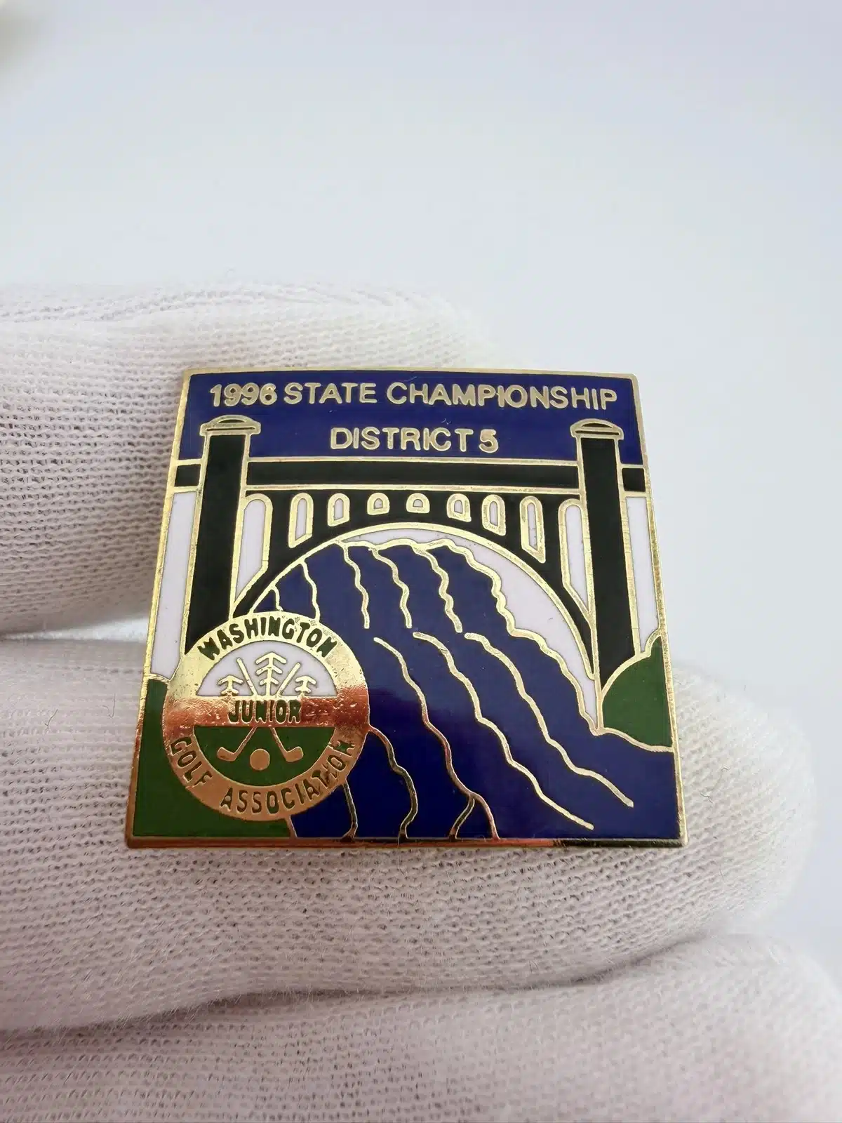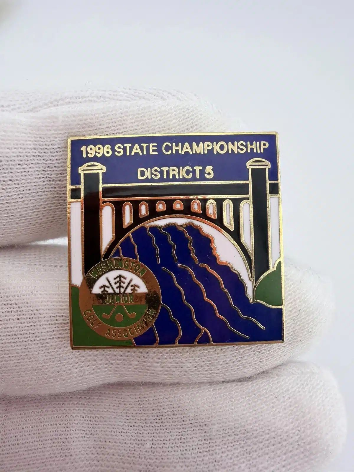 This 1996 State Championship District 5 pin from the Junior Golf Association Of Washington features a square 1 inch design with water flowing beneath a bridge as the central scene. Across the top it reads “1996 State Championship District 5,” with the Junior Golf Association Of Washington emblem positioned at the bottom left.