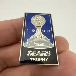 This lapel pin commemorates the 1996 Women’s Basketball Coaches Association Sears Trophy, featuring a detailed design that highlights the prestigious award’s significance in women’s collegiate basketball. The pin showcases the trophy’s iconic shape, symbolizing excellence in coaching and the advancement of women’s sports during this pivotal era.