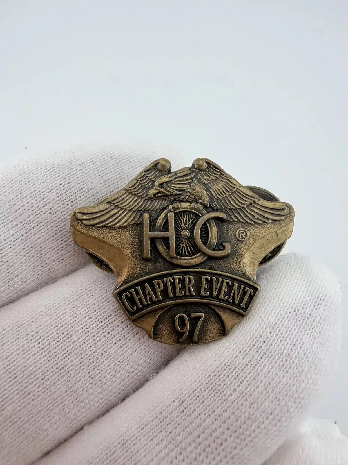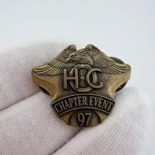 This 1997 HOG Harley Owners Group Member Chapter Event Pin showcases a striking eagle with its wings spread, gripping a motorcycle wheel that cleverly forms the letter ‘O’ in ‘HOG.’ The design prominently features the words ‘chapter event’ and ’97,’ reflecting the camaraderie and spirit of Harley enthusiasts during that year.