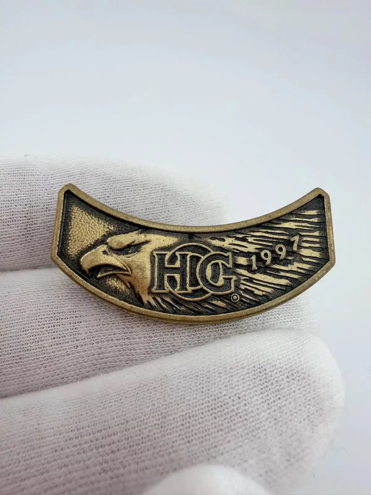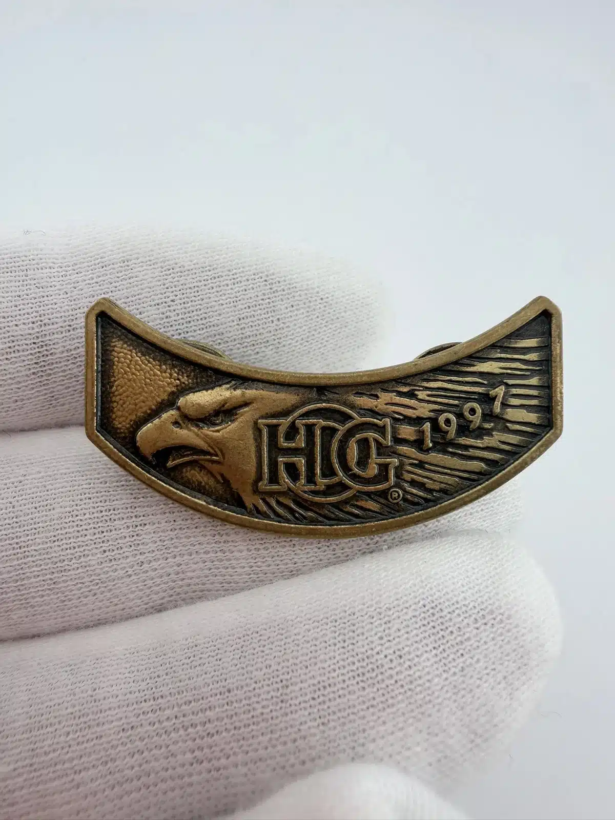 This 1997 HOG Harley Owners Group Member Pin showcases a striking eagle design, prominently featuring the HOG logo at its center. The year ‘1997’ is elegantly displayed on the right, marking the year of membership for the original owner.