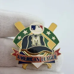 This multilayer pin features a detailed baseball themed design with crossed bats, the MLB logo on a baseball, and the infield of a stadium. It also includes a baseball cap with the Milwaukee Brewers “M” logo, and at the bottom it reads “American League.”