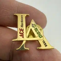 This pin features the logos of Ace Hardware and Reliance Water Heater Company, showcasing a collaboration from 1998. The design reflects the branding elements of both companies, emphasizing their connection within the home improvement and appliance industries during that time. Unsure what the LA stands for, but possibly the state of Louisiana.