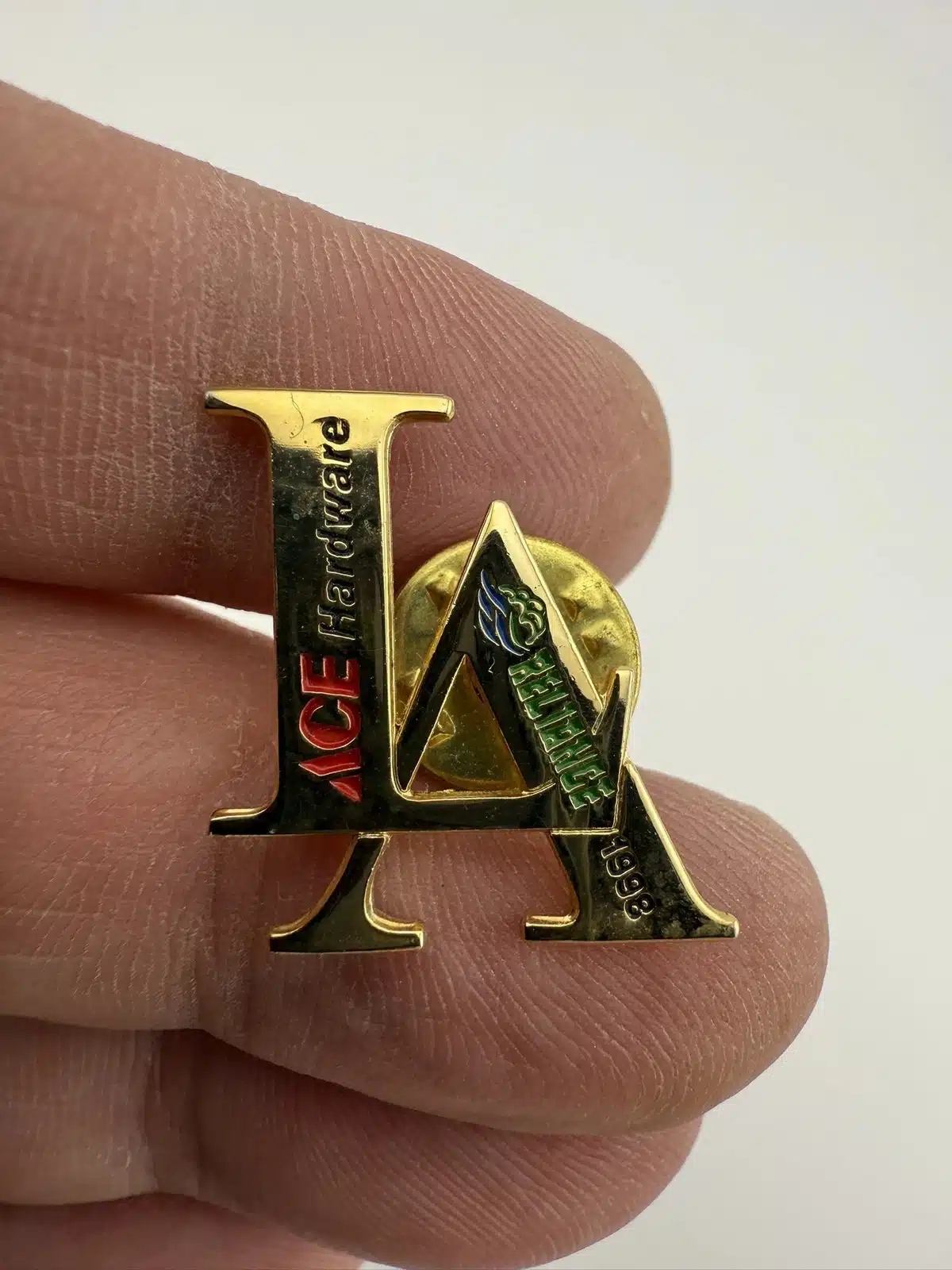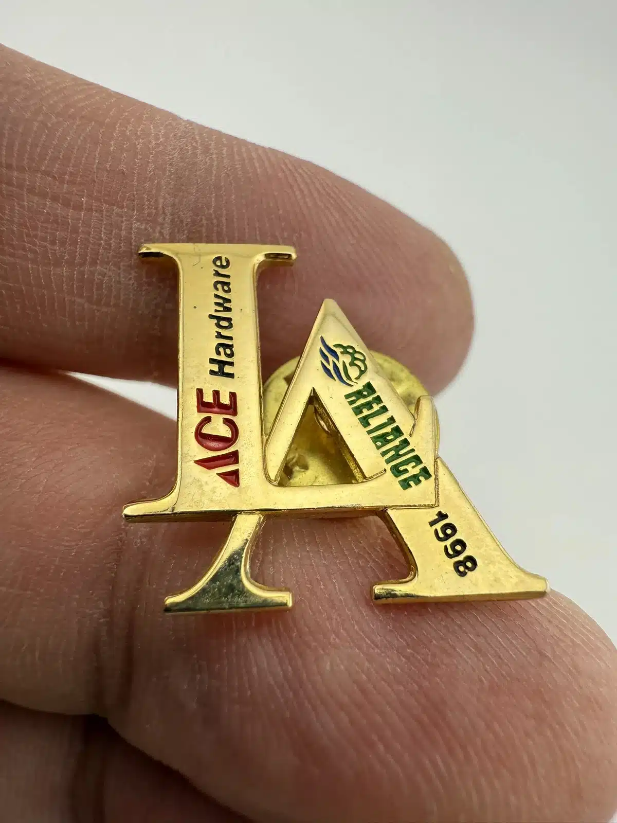 This pin features the logos of Ace Hardware and Reliance Water Heater Company, showcasing a collaboration from 1998. The design reflects the branding elements of both companies, emphasizing their connection within the home improvement and appliance industries during that time. Unsure what the LA stands for, but possibly the state of Louisiana.