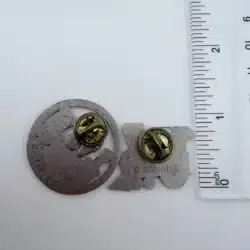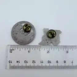 The second pin is a circular holiday design showcasing a toy soldier, train, and cheerful snowman arranged in a nostalgic Christmas scene. It measures approximately 1.25 inches in diameter.