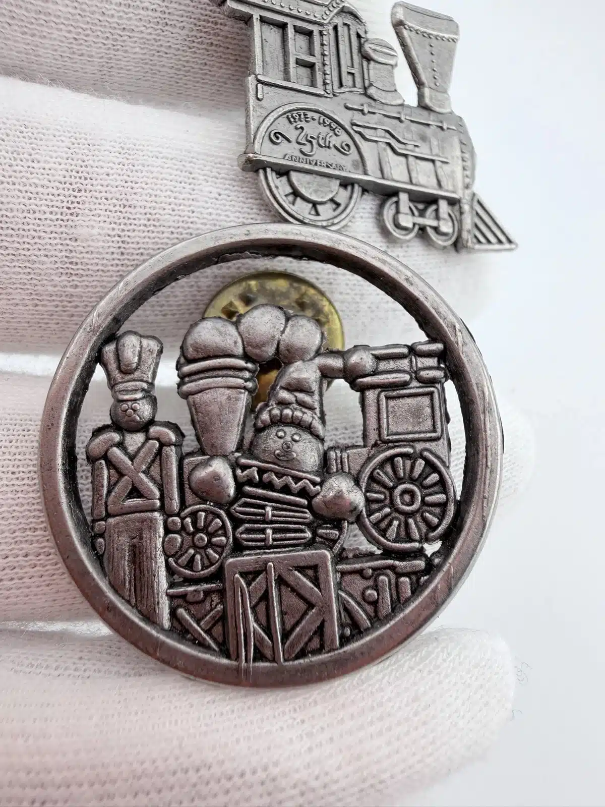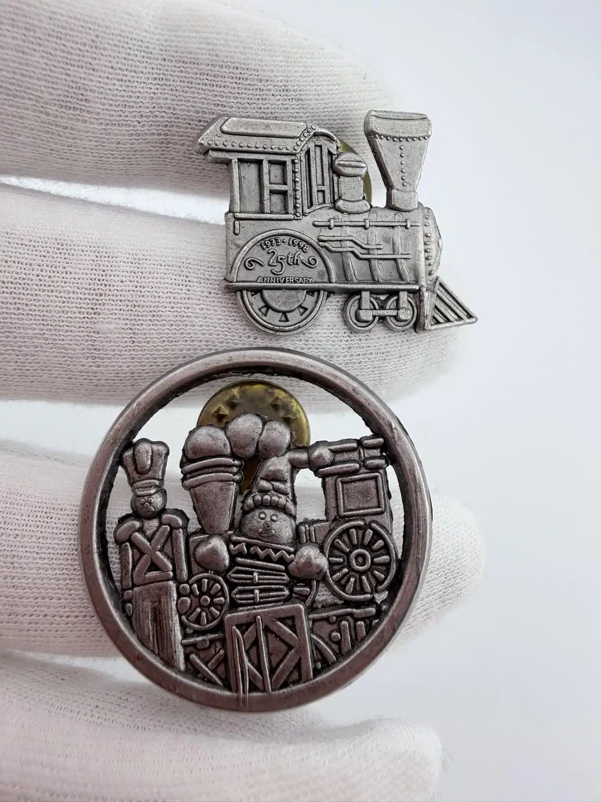 1998 Hallmark Train Locomotive Pin + Toy Soldier Snowman Train Pin