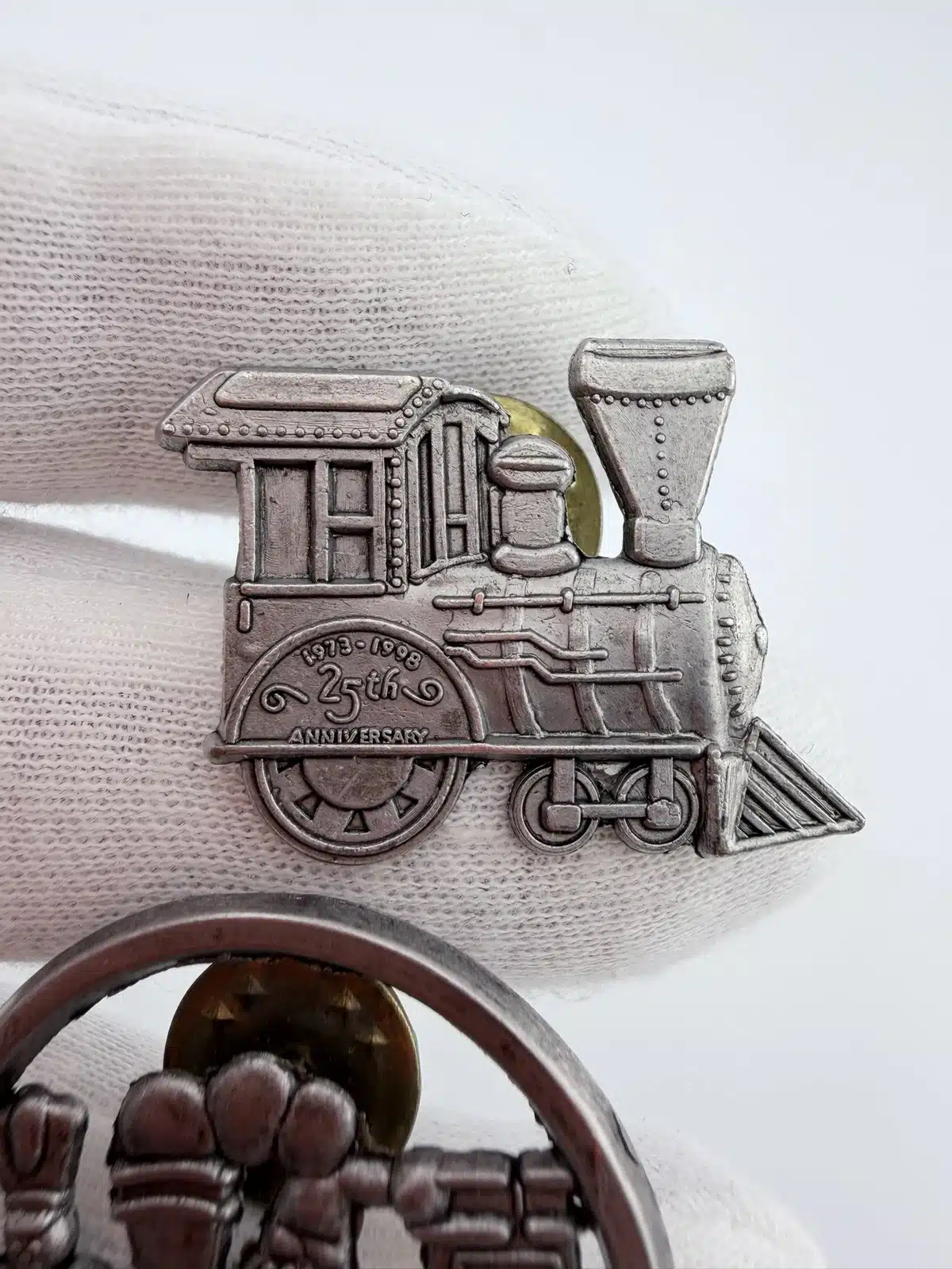 This set includes two Hallmark 1998 pins. One pin features a standalone train design, highlighting the classic charm of a locomotive in a simple, focused layout that reflects timeless holiday imagery. This pin measures in at just over 1 inch in width and just under 1 inch in height.
