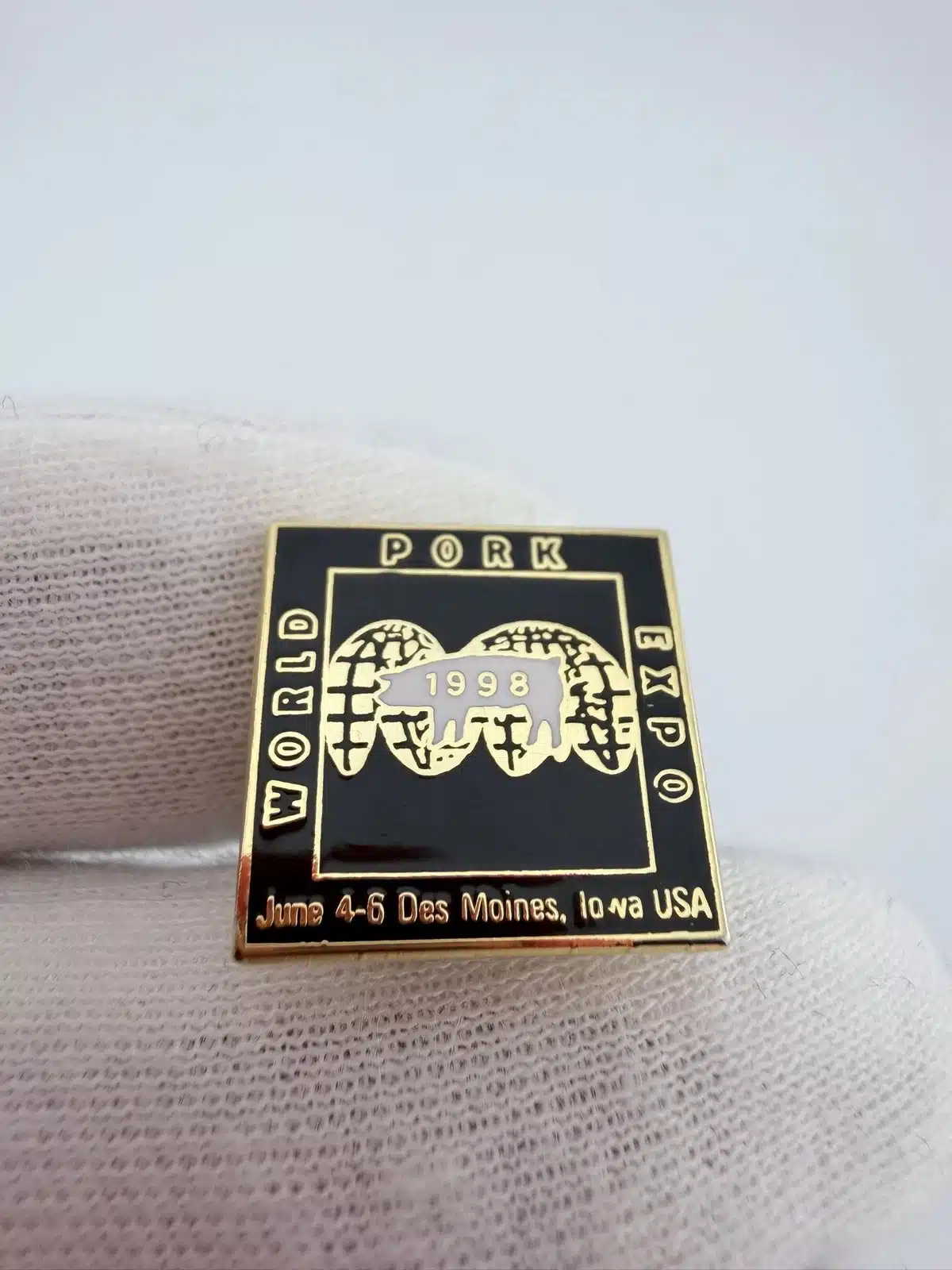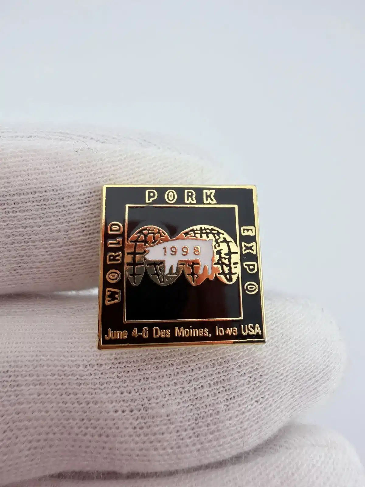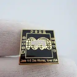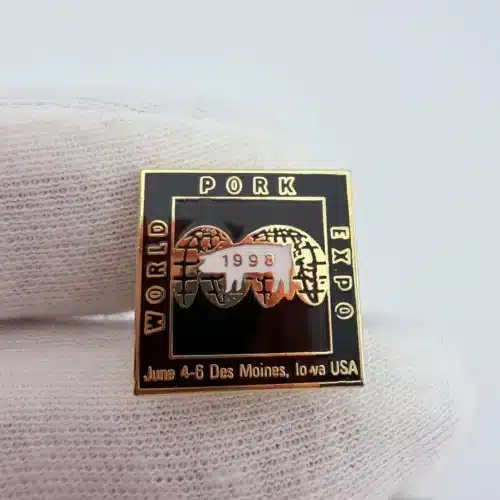 This 1998 World Pork Expo pin features a square design with black enamel and gold tone highlights, prominently displaying a pig over a globe with the year ‘1988’ inscribed. The pin commemorates the annual event, celebrating the pork industry and its global impact.