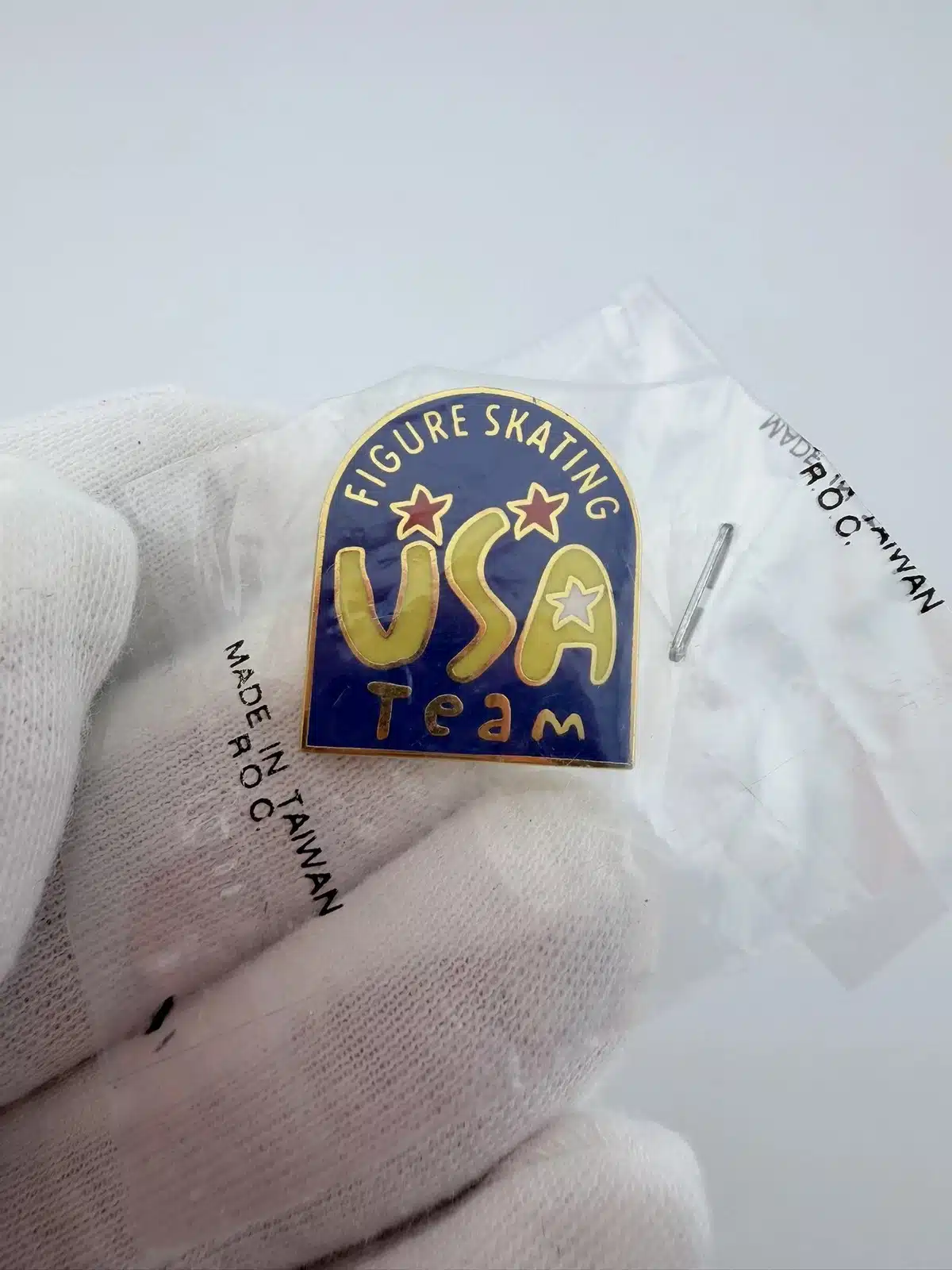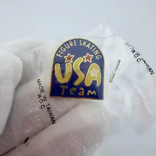This pin features ‘USA’ prominently displayed in a fun bold yellow lettering, accented by two vibrant red stars and a white star in the letter ‘A’, embodying the spirit of the 1999 US Figure Skating Team. The design reflects the pride and patriotism associated with Team USA’s figure skating squad.