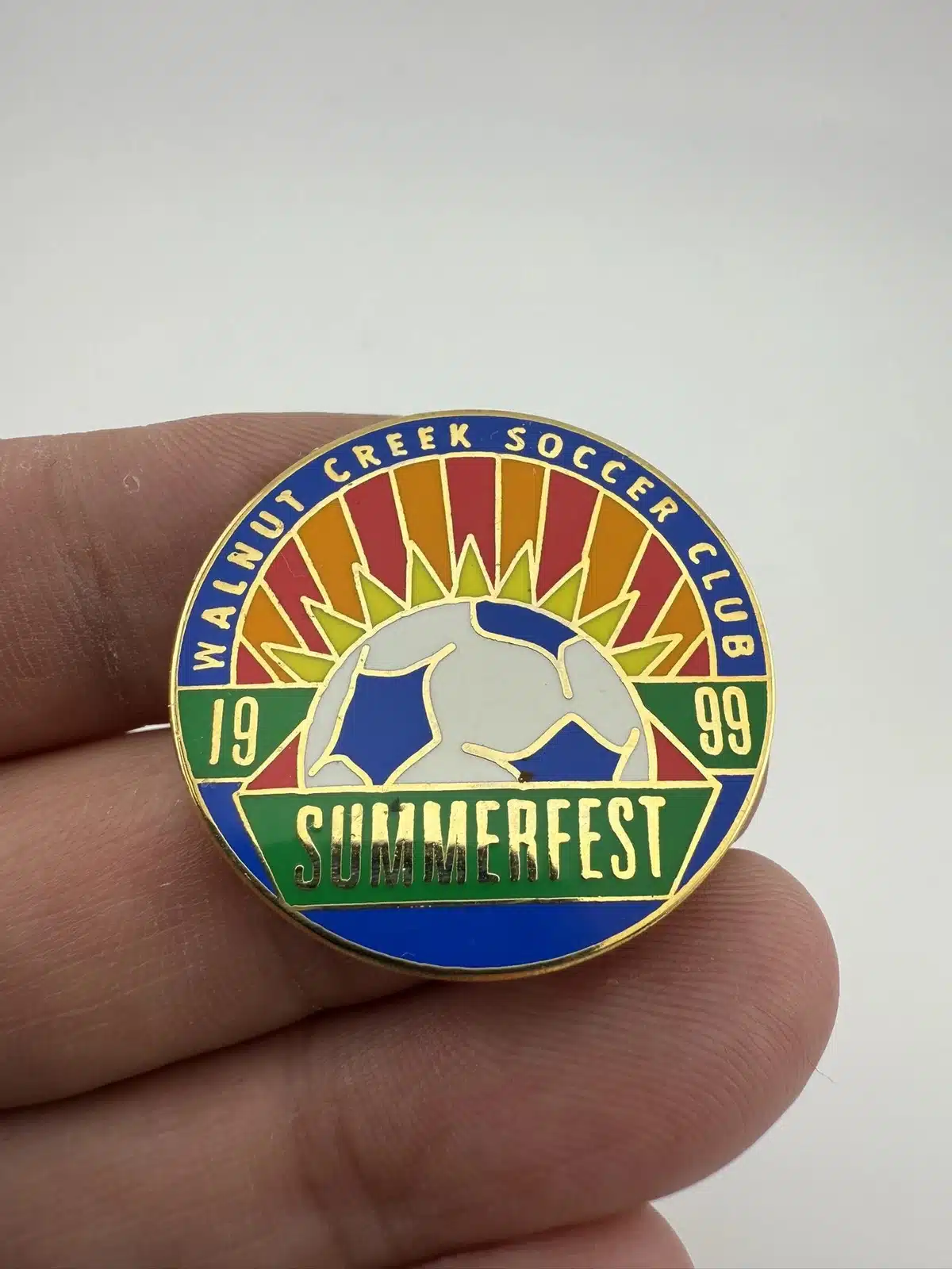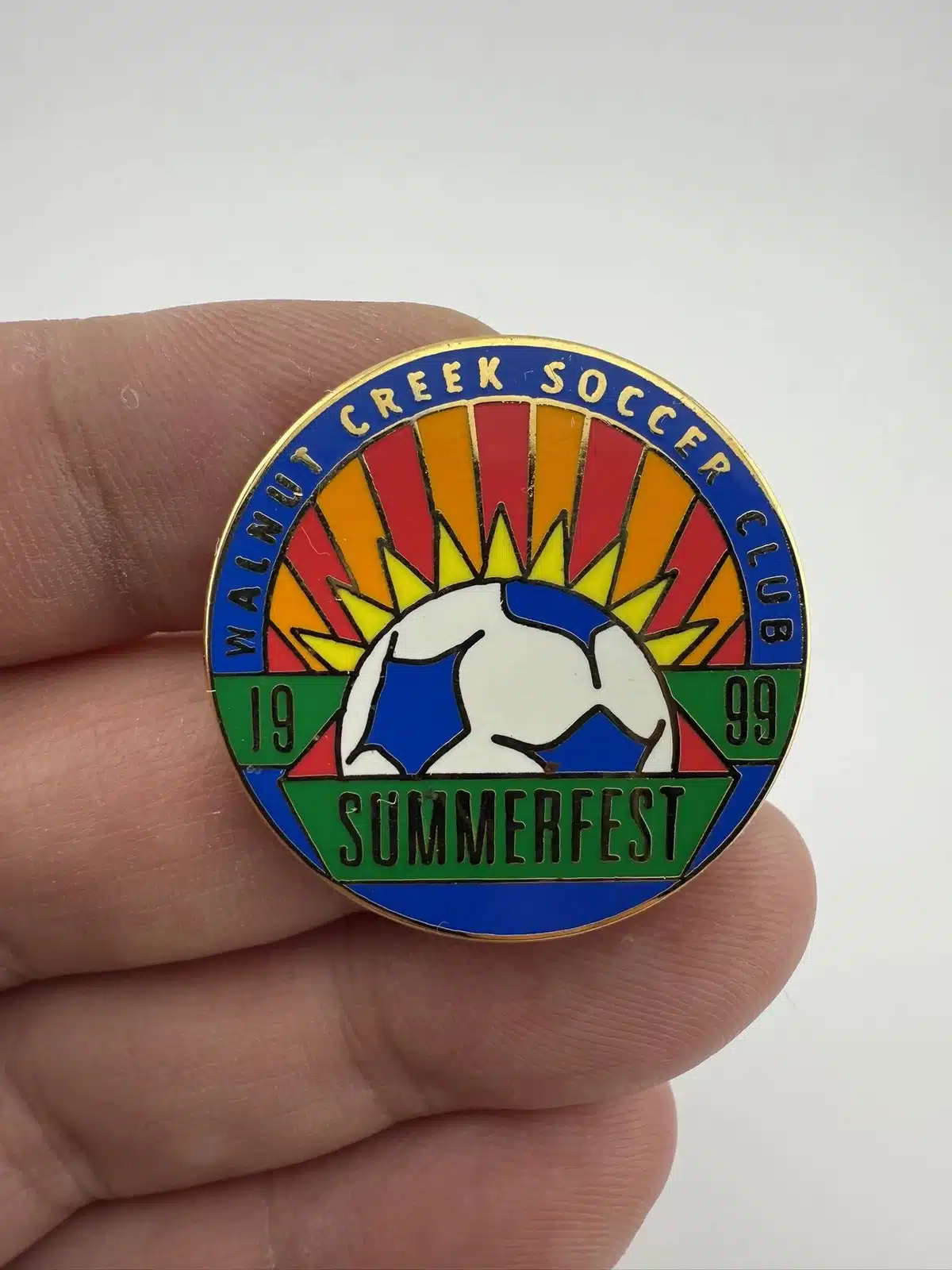 Cool pin from the 1999 Walnut Creek Soccer Club Summerfest event. Pin features a blue and white soccer ball and a setting sun along with rays.