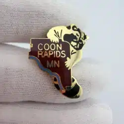 The first pin features a distinctive city limits shape adorned with a raccoon, symbolizing the playful spirit of Coon Rapids, Minnesota. The second pin showcases a green leaf positioned between the words ‘Coon’ and ‘Rapids’, reflecting the area’s natural beauty and commitment to environmental preservation.
