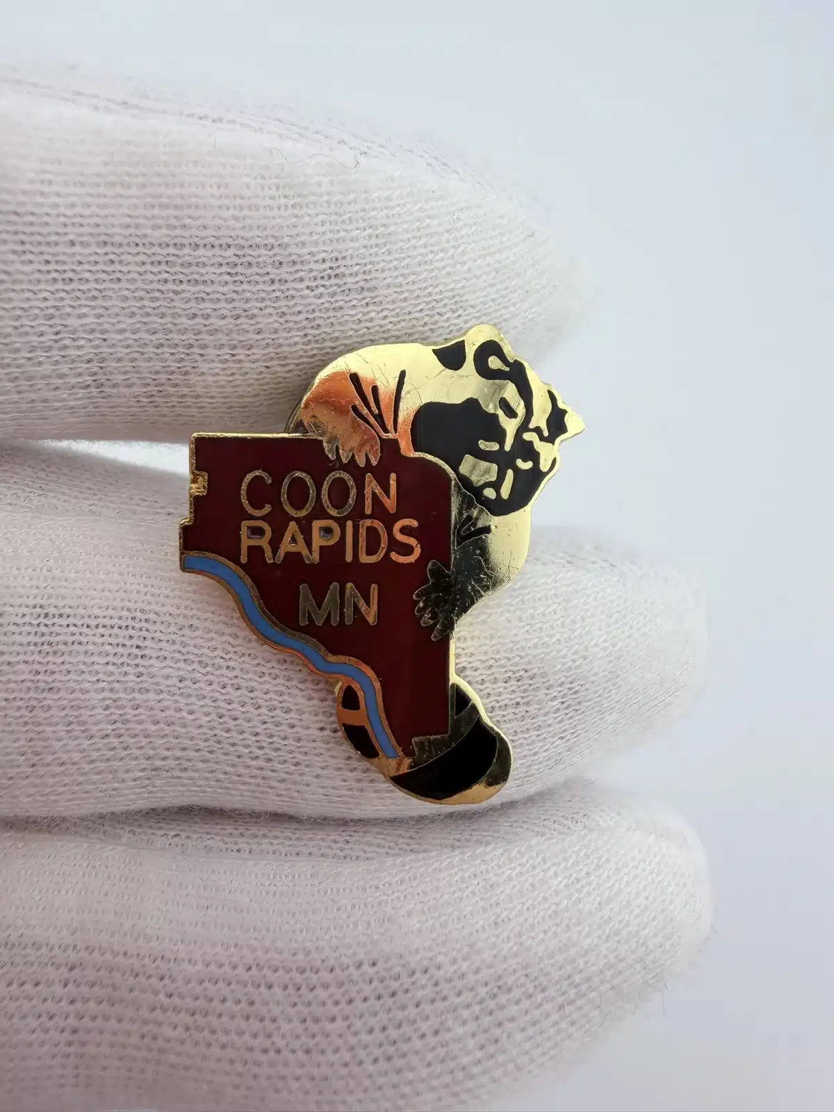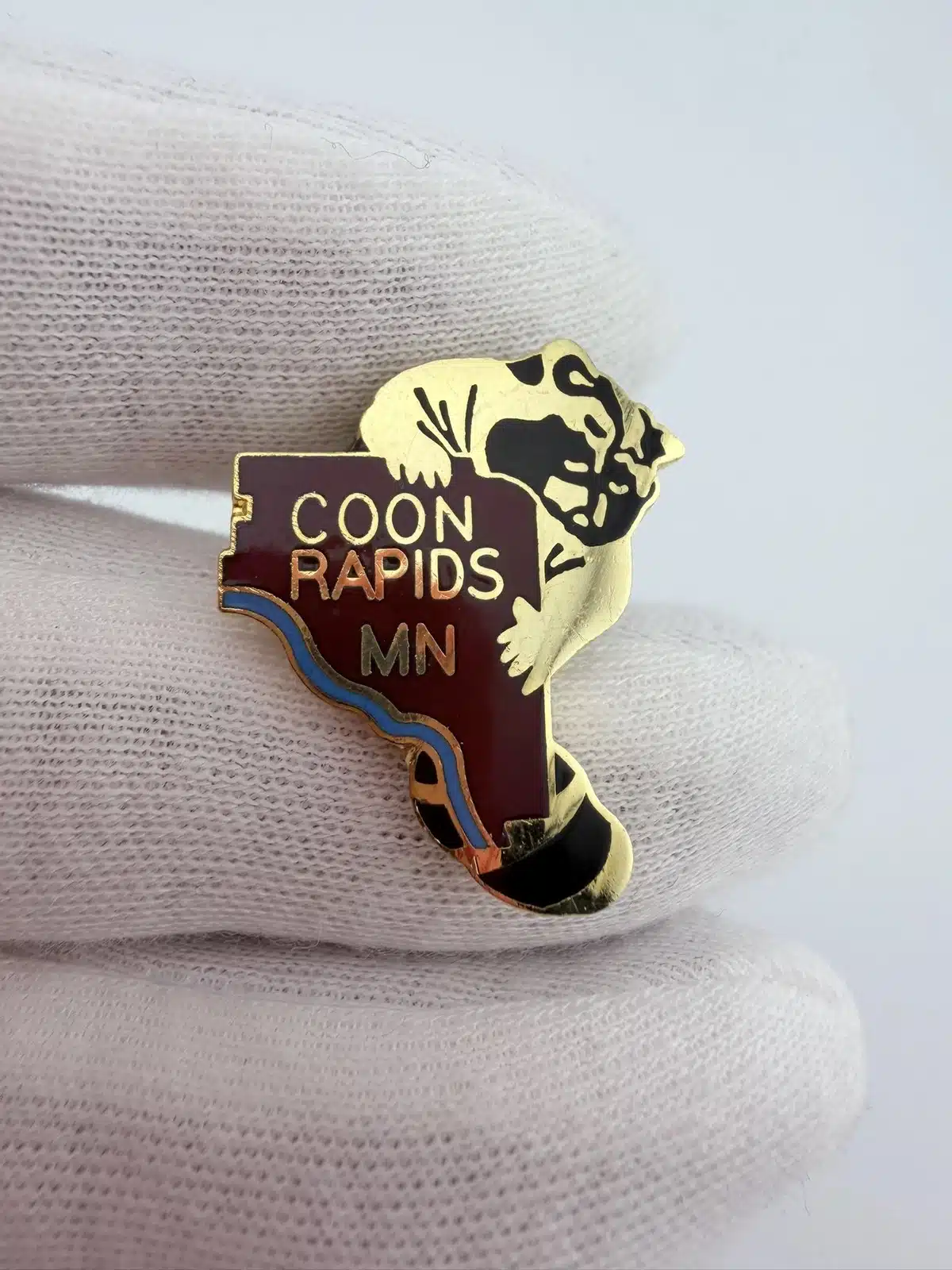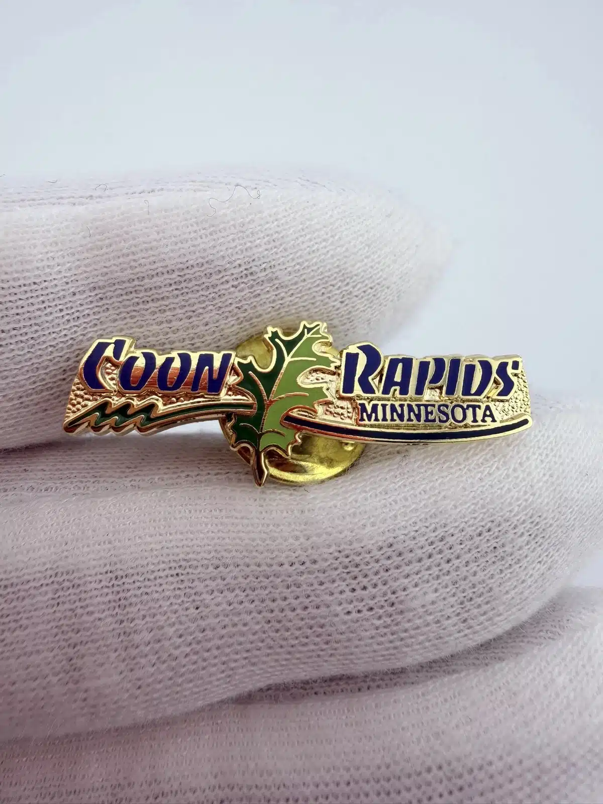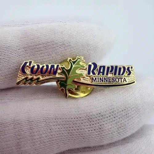 The first pin features a distinctive city limits shape adorned with a raccoon, symbolizing the playful spirit of Coon Rapids, Minnesota. The second pin showcases a green leaf positioned between the words ‘Coon’ and ‘Rapids’, reflecting the area’s natural beauty and commitment to environmental preservation.