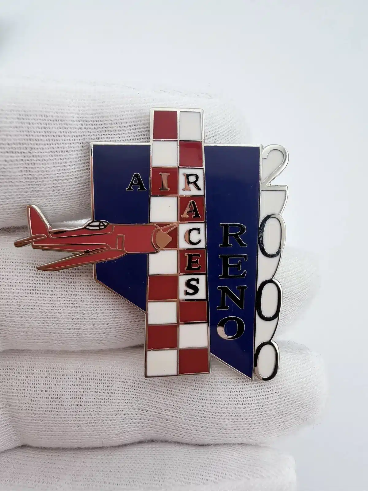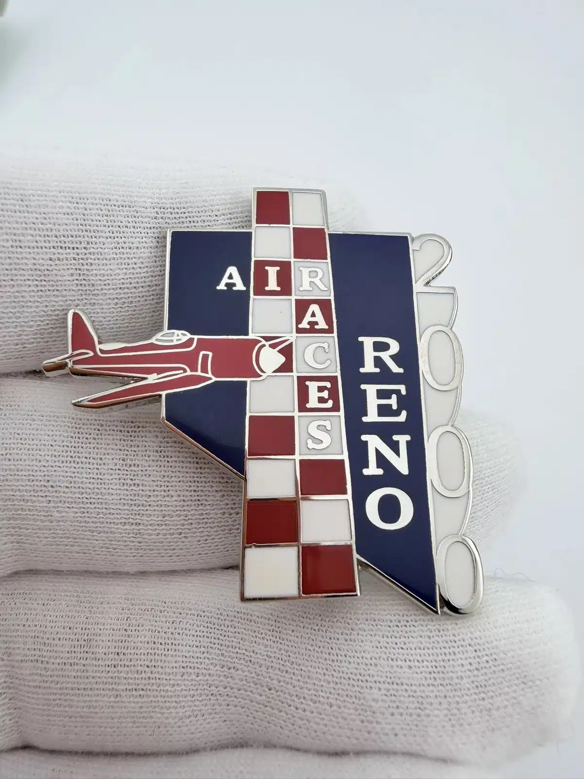 This pin features a dynamic red airplane soaring past a striking red and white checkered pylon, symbolizing the excitement of the 2000 Reno National Championship Air Races. The design is enhanced with vibrant blue, red, and white enamel, complemented by silver tone highlights that capture the essence of this thrilling aviation event.
