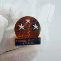 This pin features wavy blue stripes and white stars, embodying the patriotic spirit of Team USA. The cursive ‘USA’ is prominently displayed above the text ‘FIGURE SKATING TEAM’ at the bottom, celebrating the sport and its athletes during the year 2000.